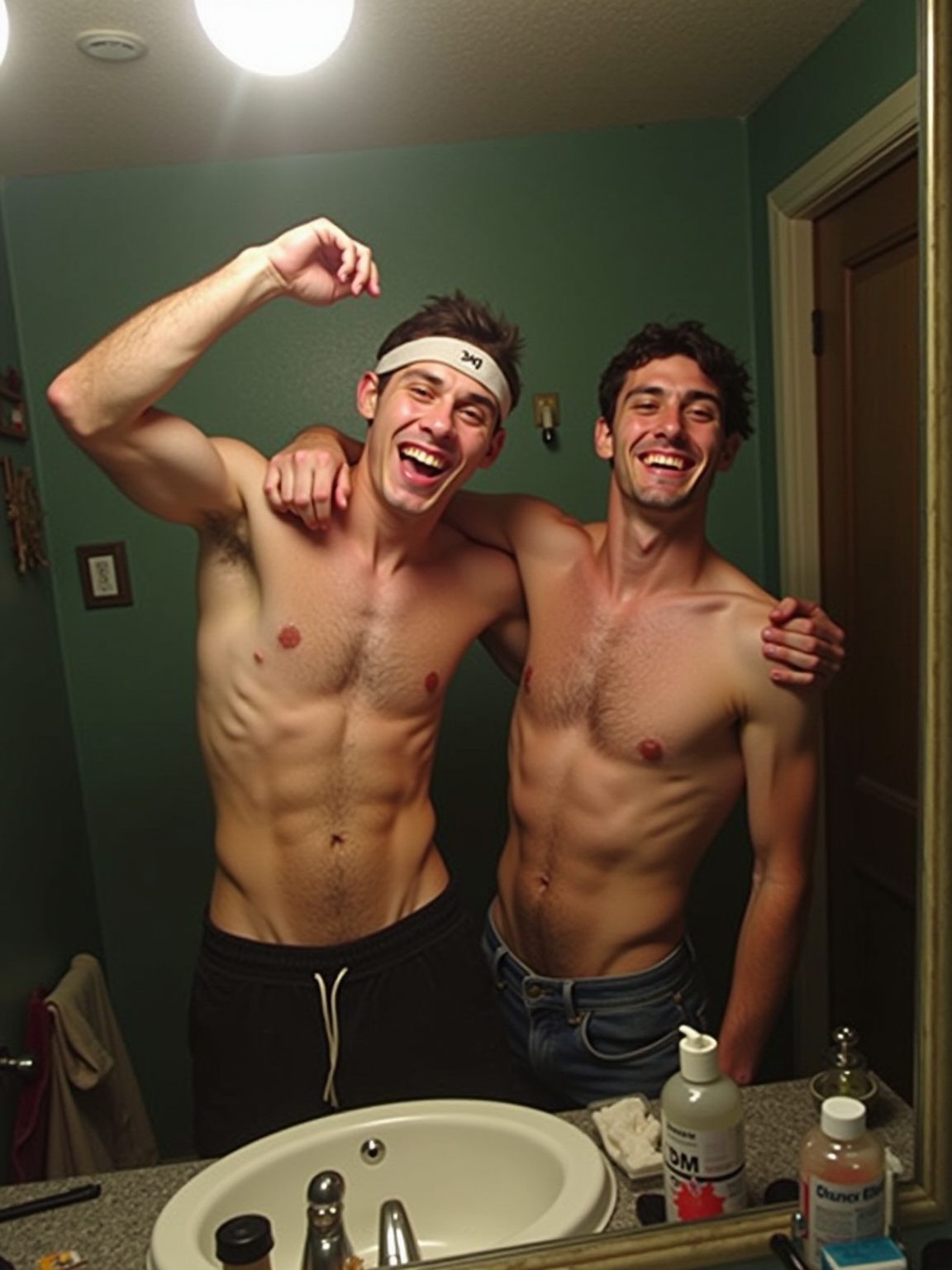 camera flash overexposed, model in a cramped bathroom mirror selfie with friends. Wearing beanie, goofy grin, arm around friend. Flash reflection, cluttered counter, chaotic fun.