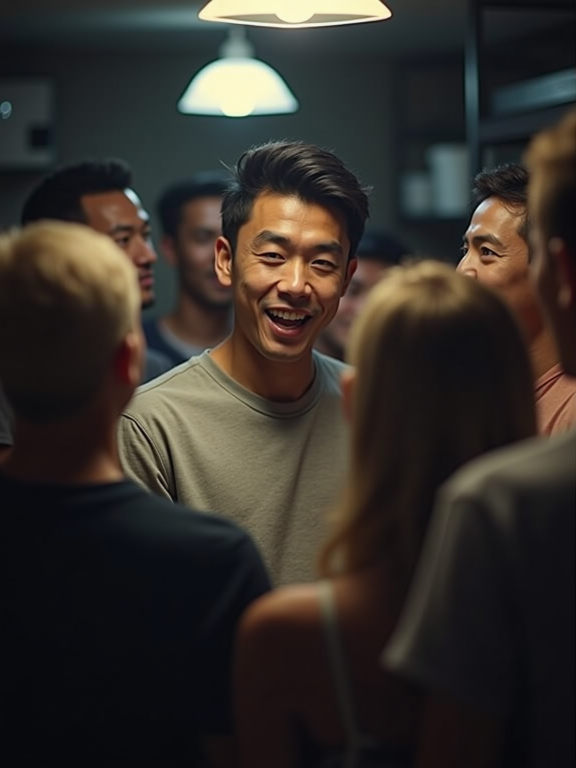 camera flash overexposed, model in a crowded kitchen, people talking and laughing around. Wearing t-shirt, mid-conversation. Flash, candid, social chaos.