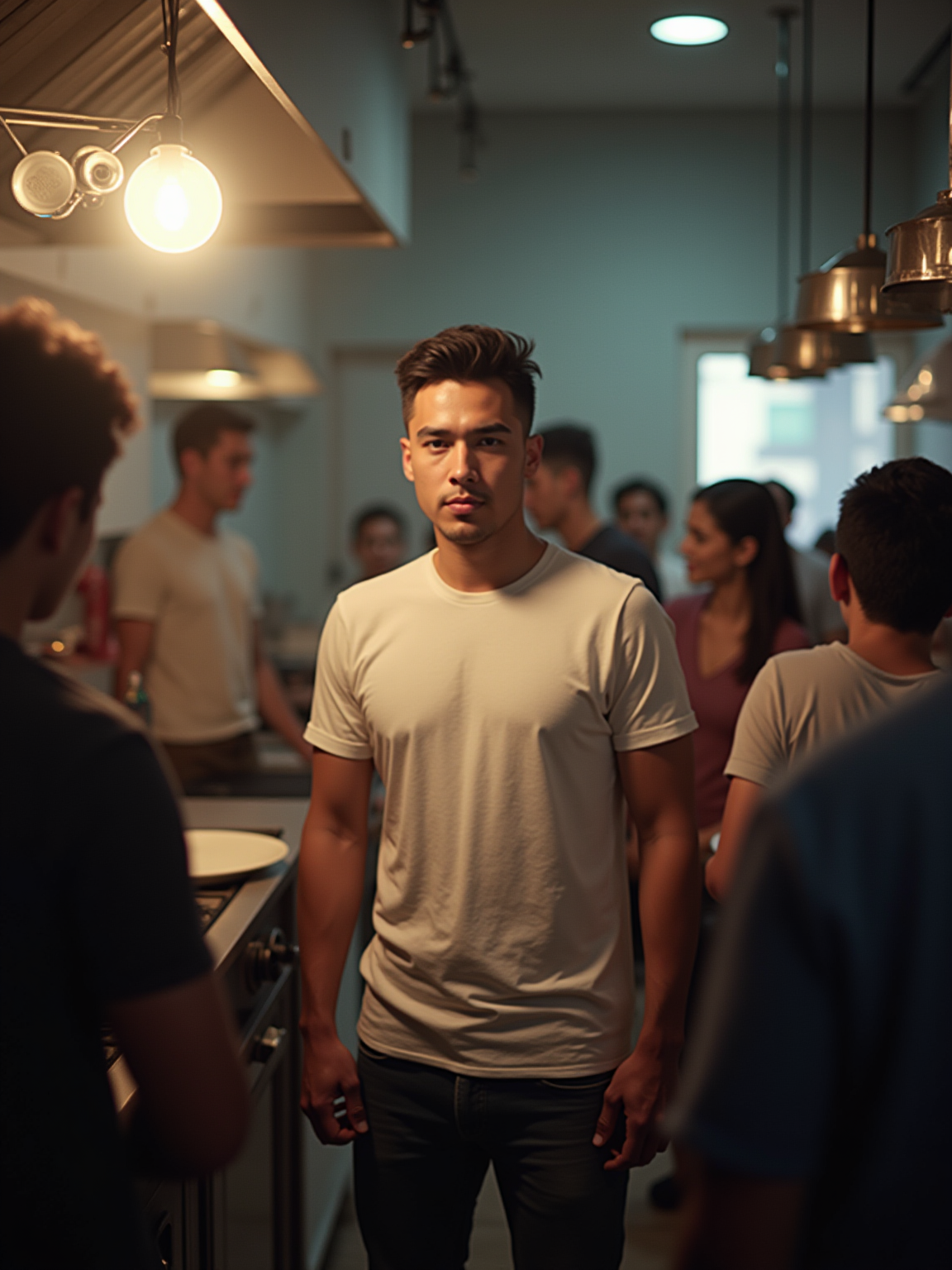 camera flash overexposed, model in a crowded kitchen, people talking and laughing around. Wearing t-shirt, mid-conversation. Flash, candid, social chaos.