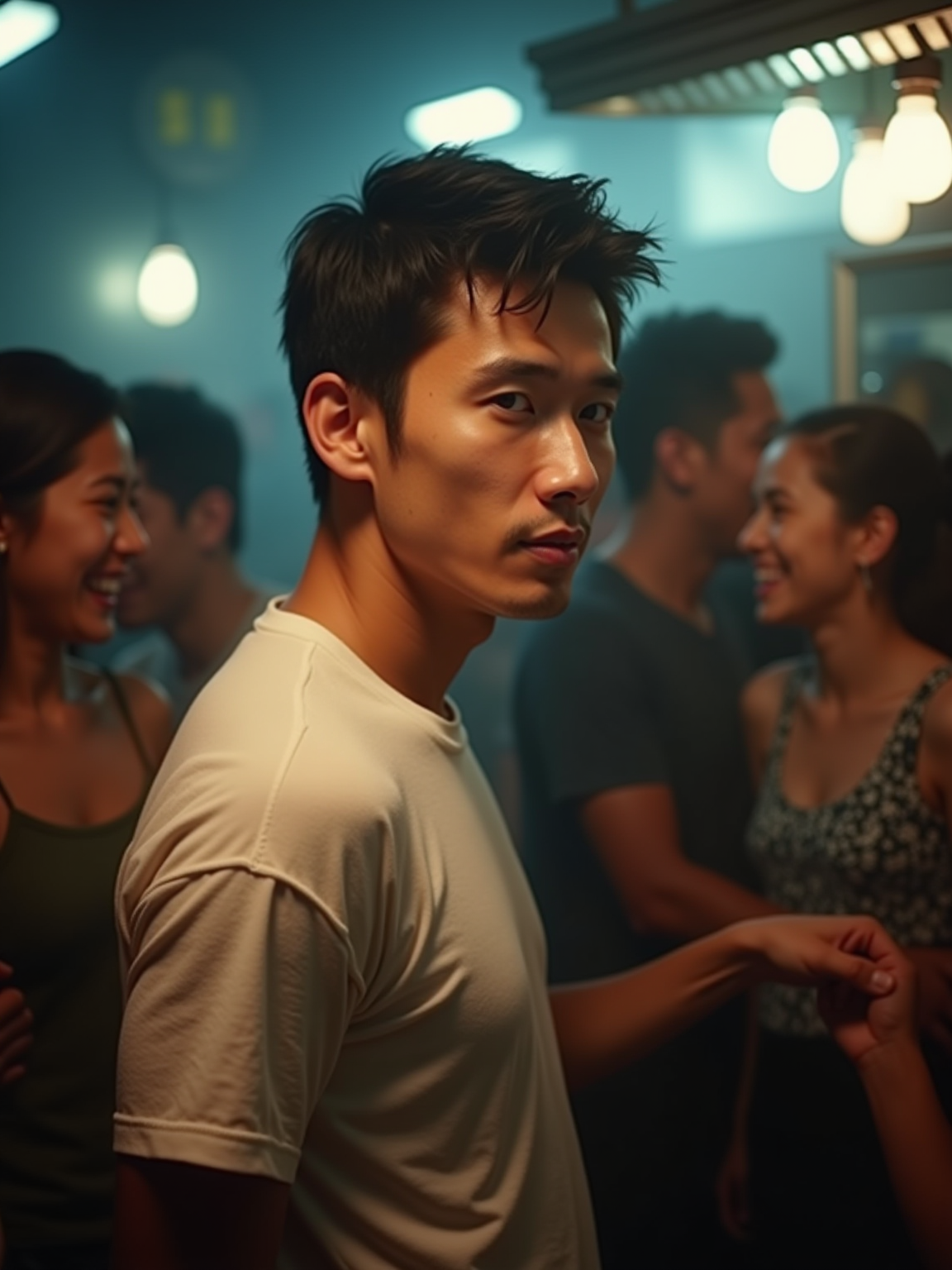 camera flash overexposed, model in a crowded kitchen, people talking and laughing around. Wearing t-shirt, mid-conversation. Flash, candid, social chaos.