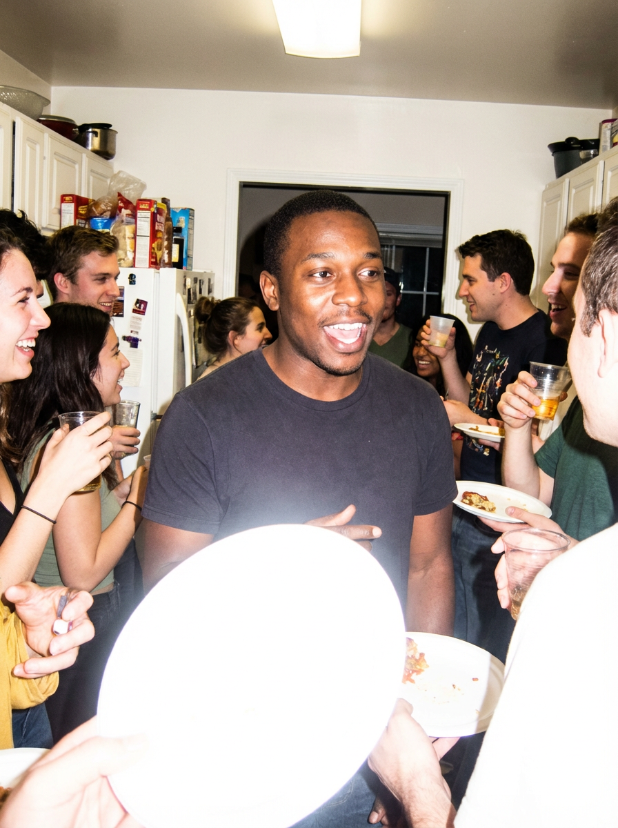 camera flash overexposed, model in a crowded kitchen, people talking and laughing around. Wearing t-shirt, mid-conversation. Flash, candid, social chaos.