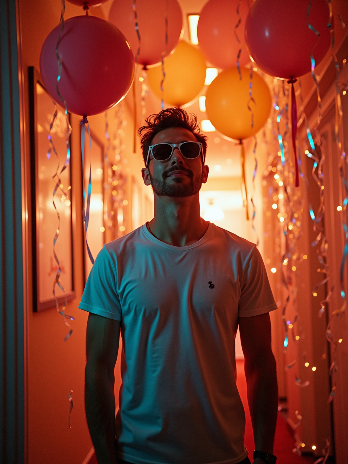 camera flash overexposed, model in a hallway with party streamers and balloons. Wearing sunglasses indoors, goofy pose. Flash, decorations, celebration energy.
