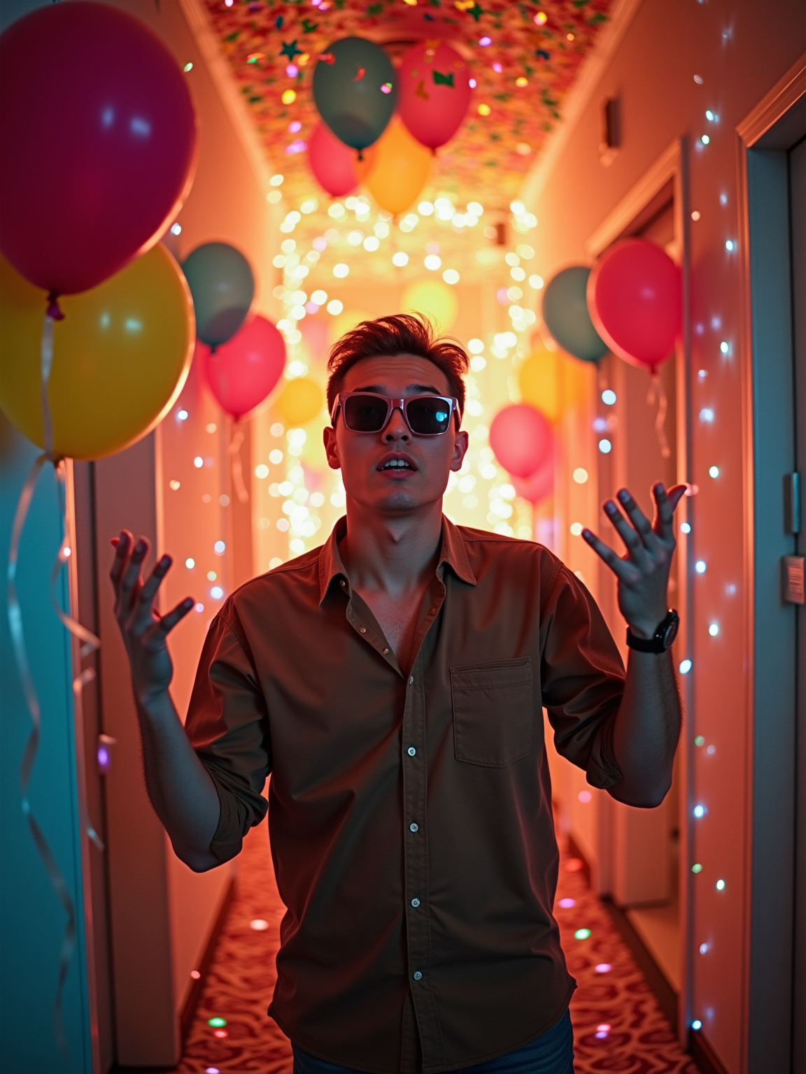 camera flash overexposed, model in a hallway with party streamers and balloons. Wearing sunglasses indoors, goofy pose. Flash, decorations, celebration energy.