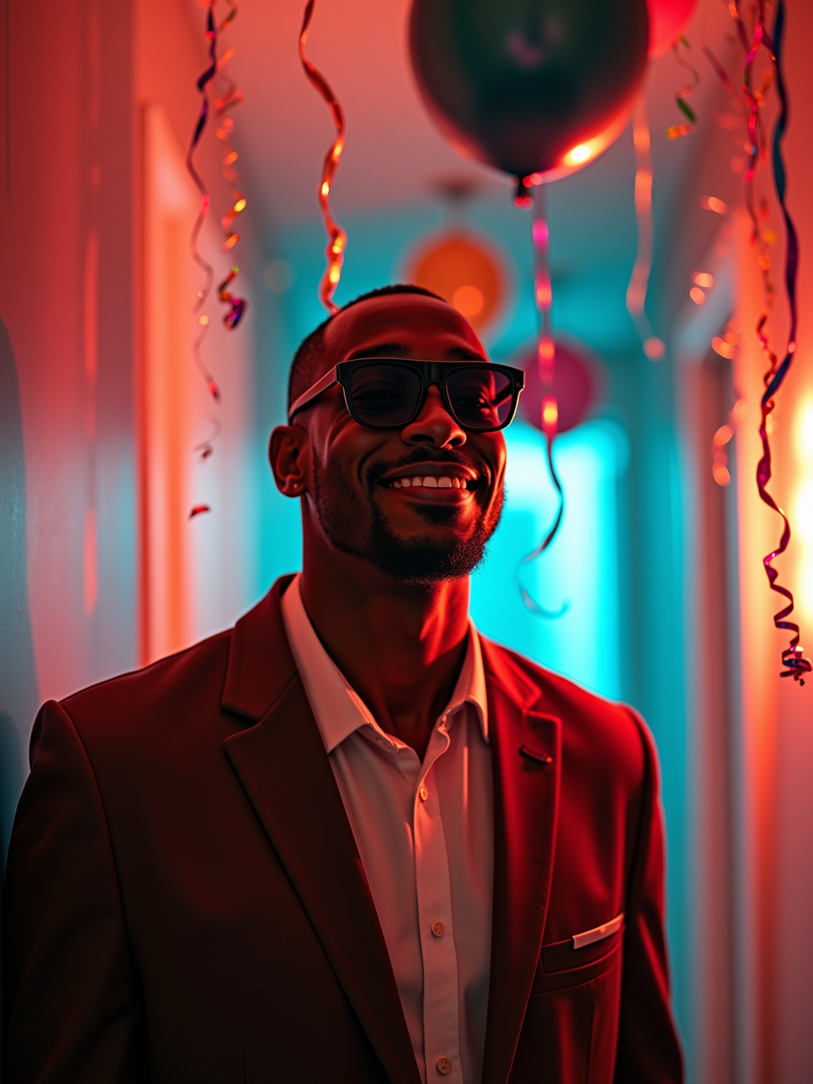 camera flash overexposed, model in a hallway with party streamers and balloons. Wearing sunglasses indoors, goofy pose. Flash, decorations, celebration energy.