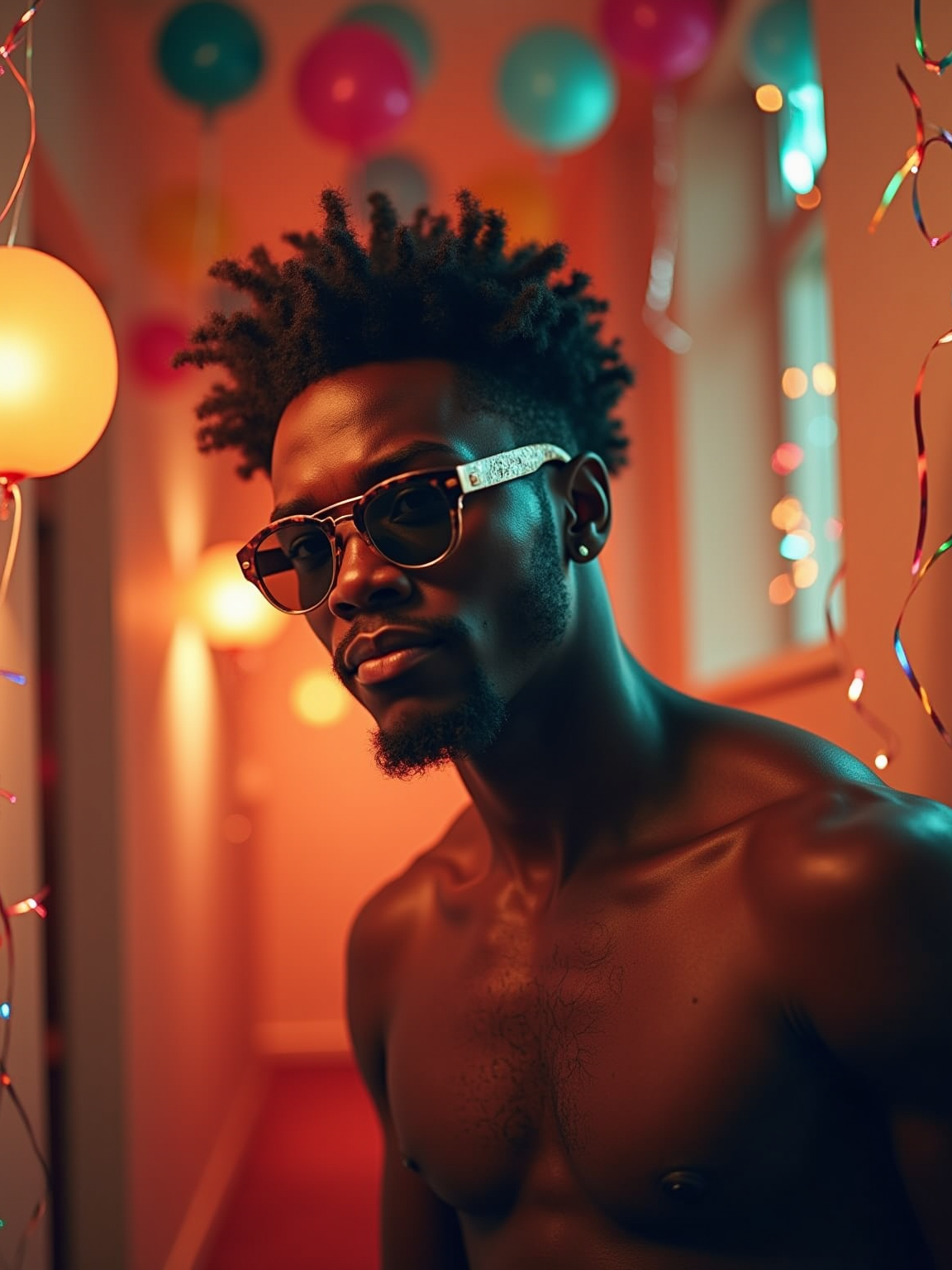 camera flash overexposed, model in a hallway with party streamers and balloons. Wearing sunglasses indoors, goofy pose. Flash, decorations, celebration energy.