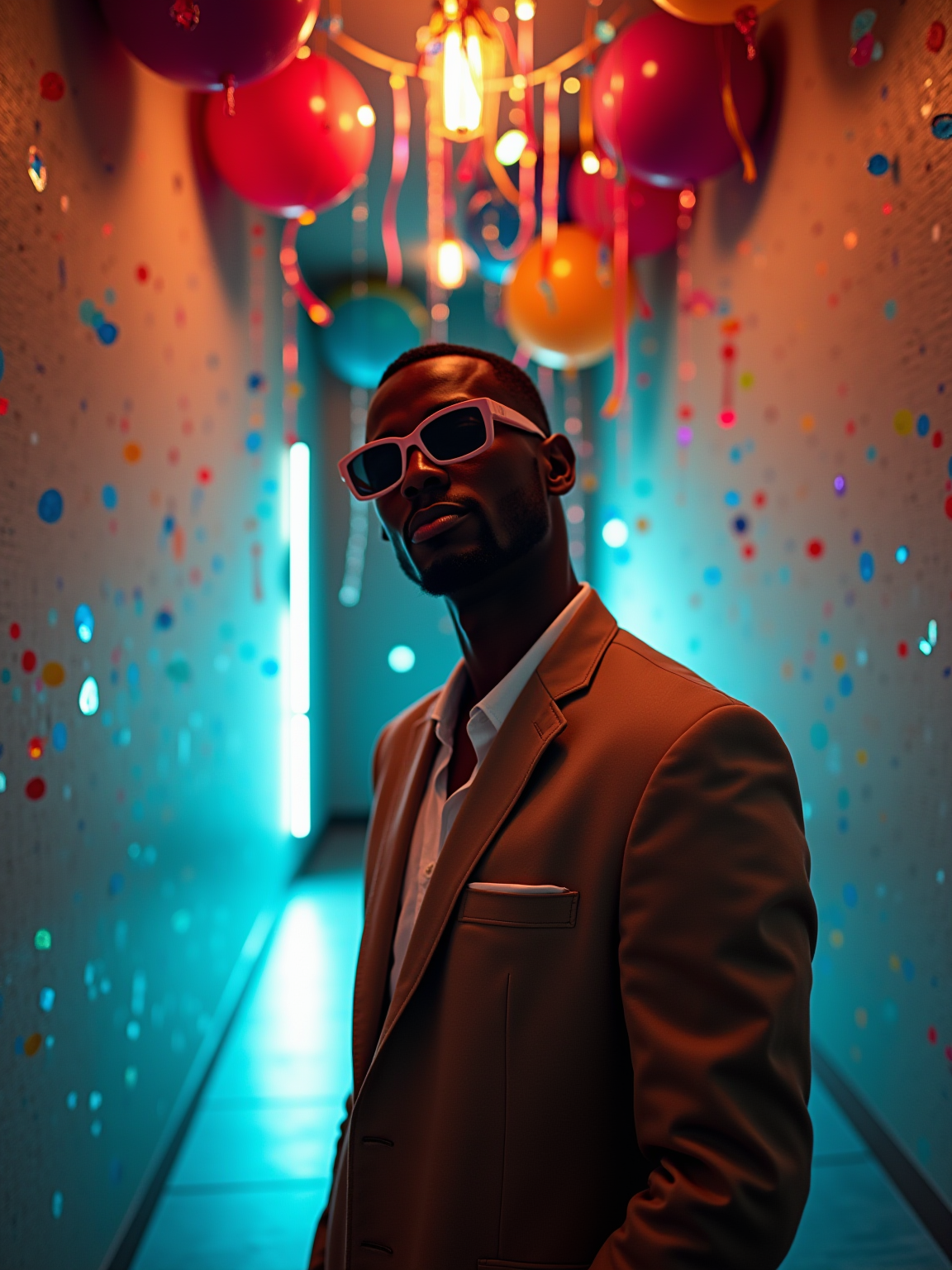 camera flash overexposed, model in a hallway with party streamers and balloons. Wearing sunglasses indoors, goofy pose. Flash, decorations, celebration energy.