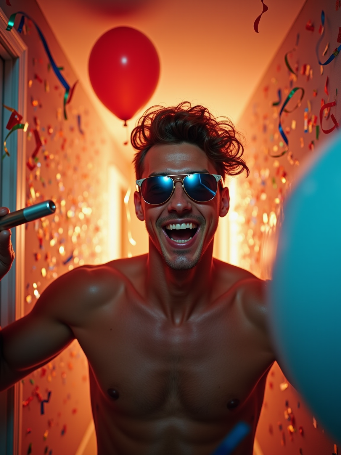 camera flash overexposed, model in a hallway with party streamers and balloons. Wearing sunglasses indoors, goofy pose. Flash, decorations, celebration energy.