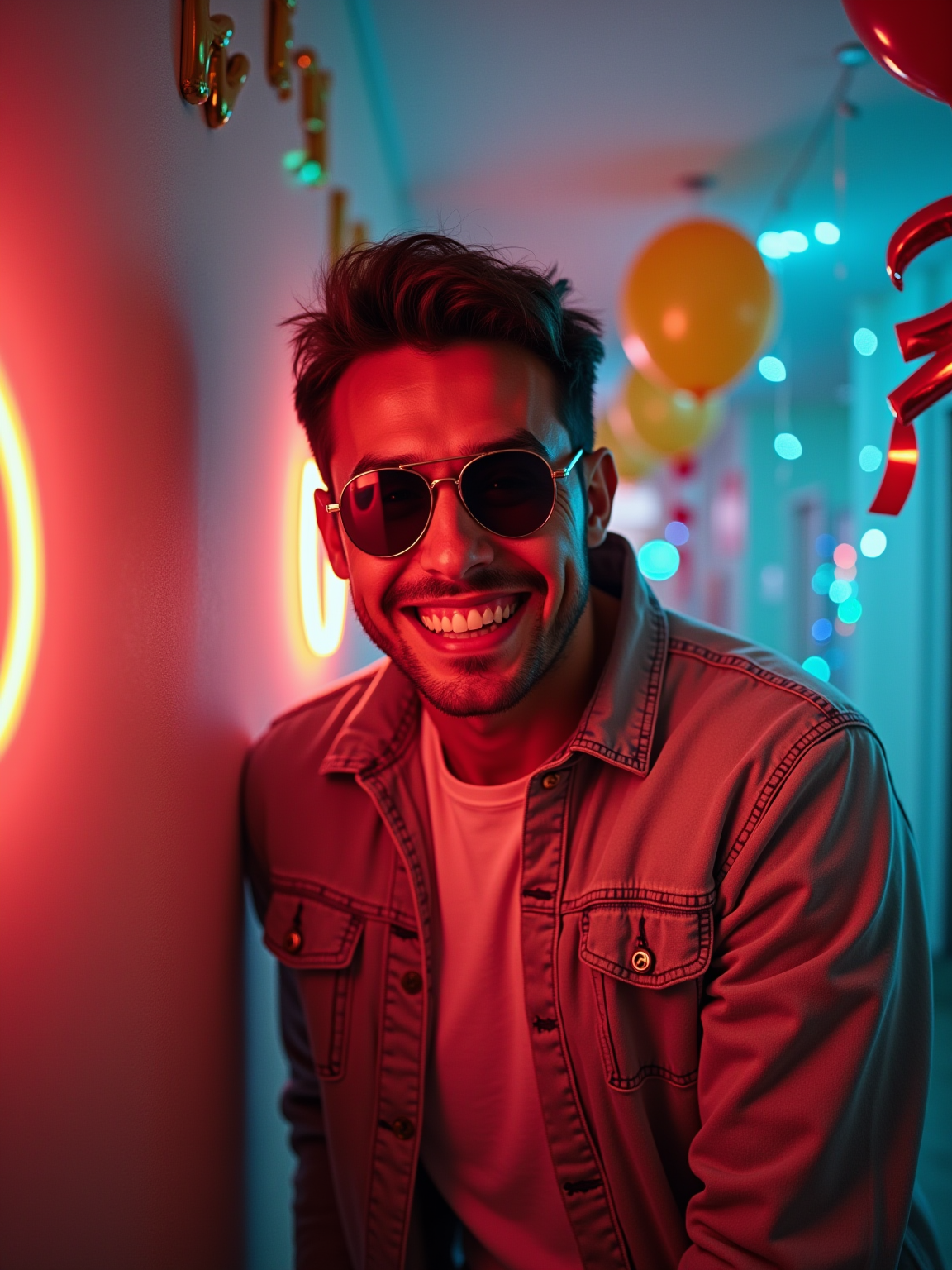 camera flash overexposed, model in a hallway with party streamers and balloons. Wearing sunglasses indoors, goofy pose. Flash, decorations, celebration energy.