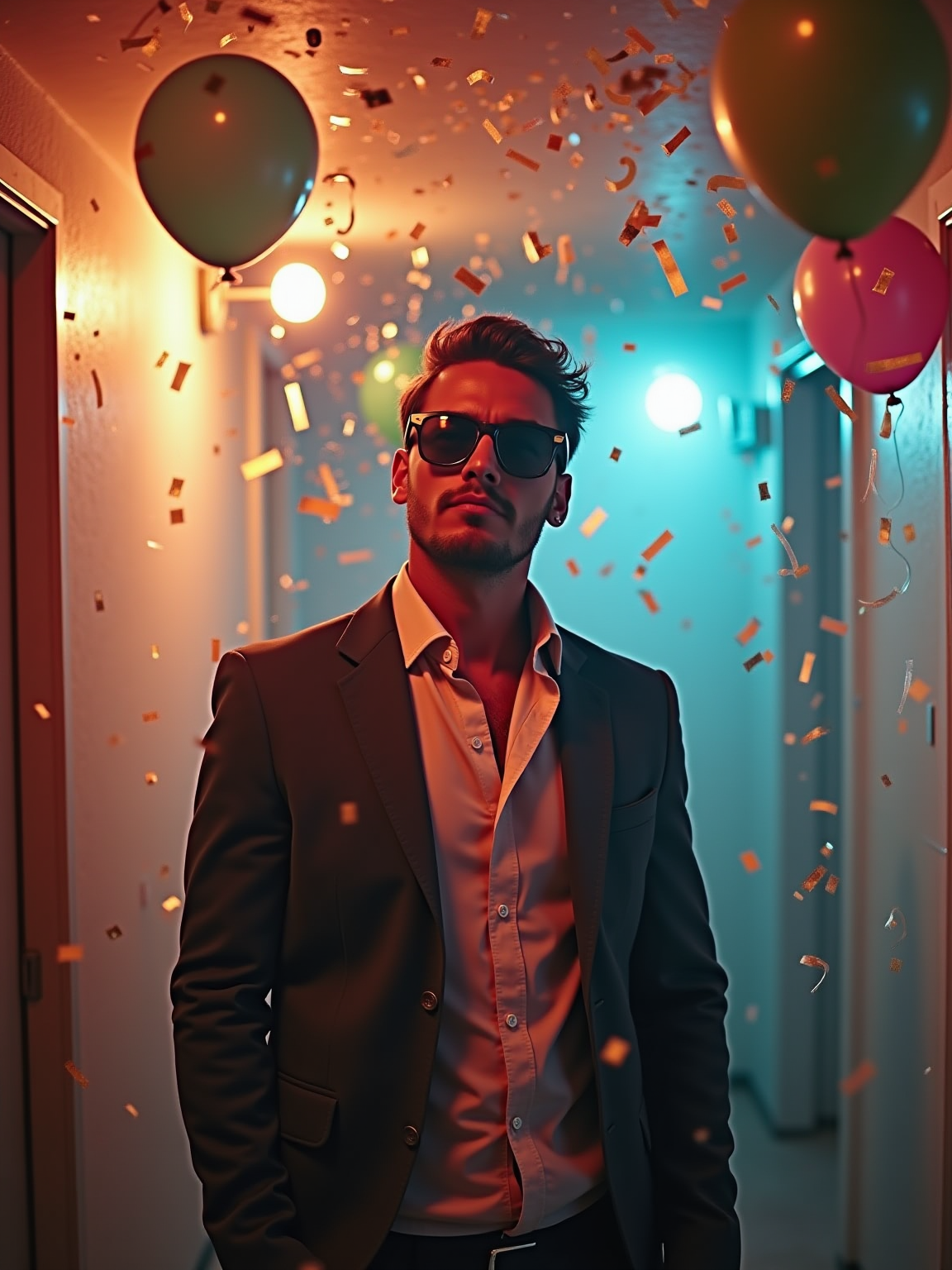 camera flash overexposed, model in a hallway with party streamers and balloons. Wearing sunglasses indoors, goofy pose. Flash, decorations, celebration energy.