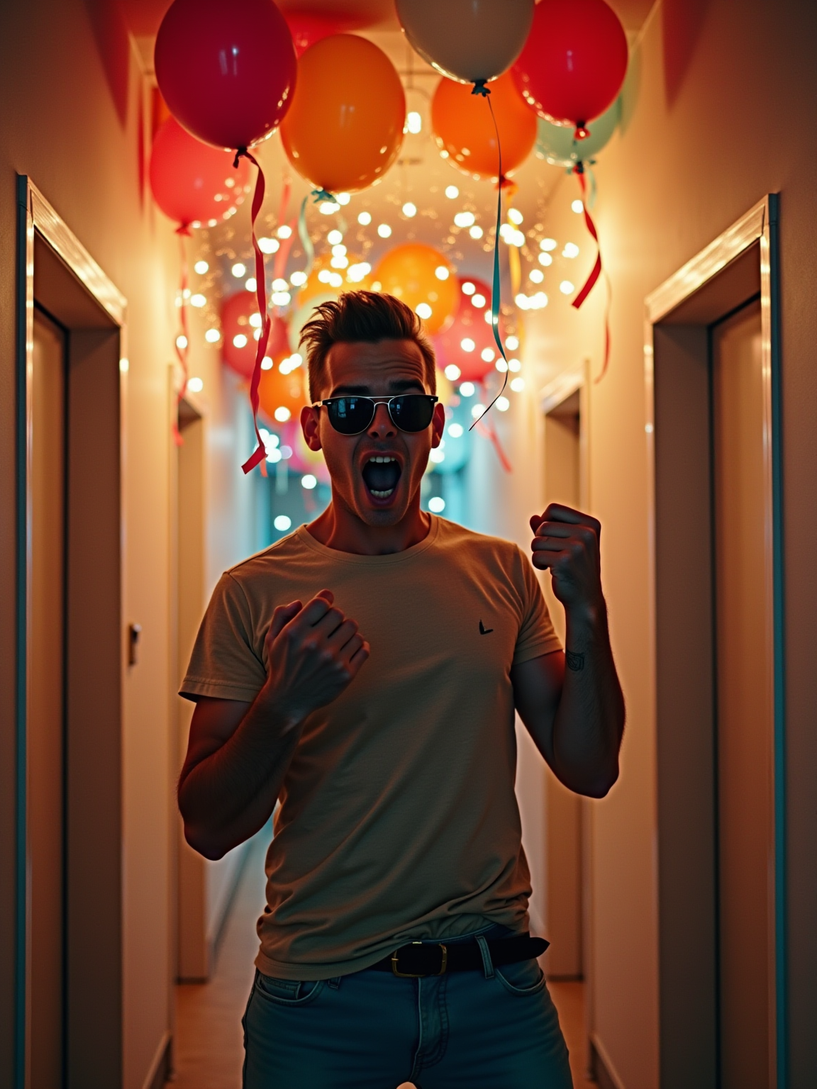camera flash overexposed, model in a hallway with party streamers and balloons. Wearing sunglasses indoors, goofy pose. Flash, decorations, celebration energy.