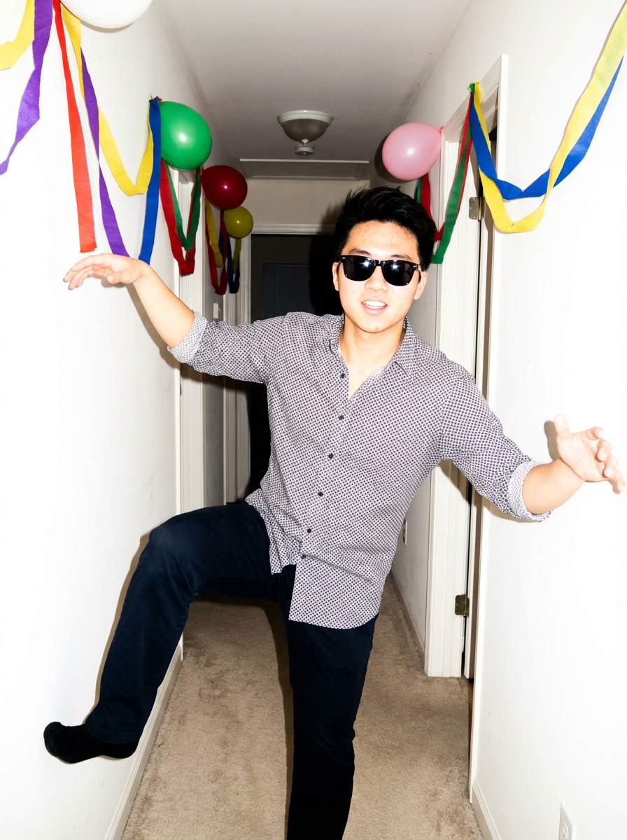 camera flash overexposed, model in a hallway with party streamers and balloons. Wearing sunglasses indoors, goofy pose. Flash, decorations, celebration energy.