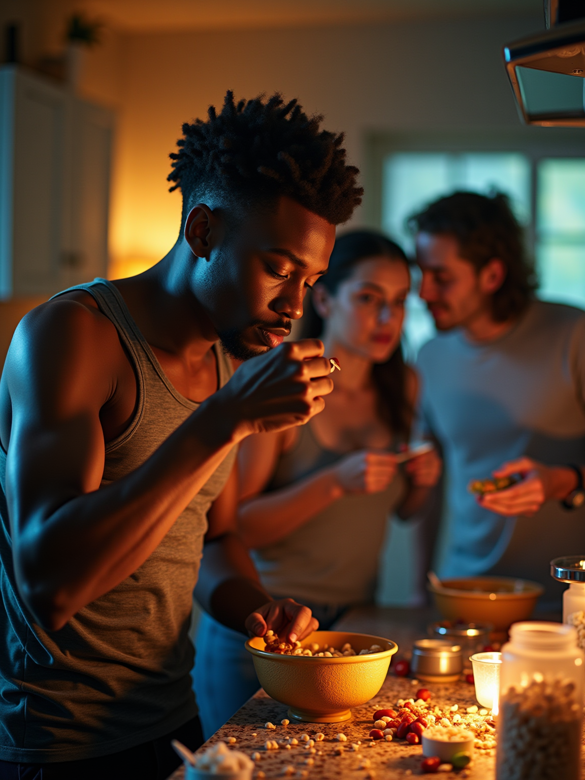 camera flash overexposed, model in a kitchen with friends making midnight snacks. Wearing tank top, eating cereal. Flash-lit, cluttered, fun chaos.