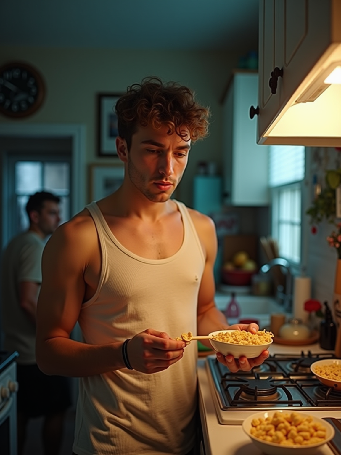 camera flash overexposed, model in a kitchen with friends making midnight snacks. Wearing tank top, eating cereal. Flash-lit, cluttered, fun chaos.