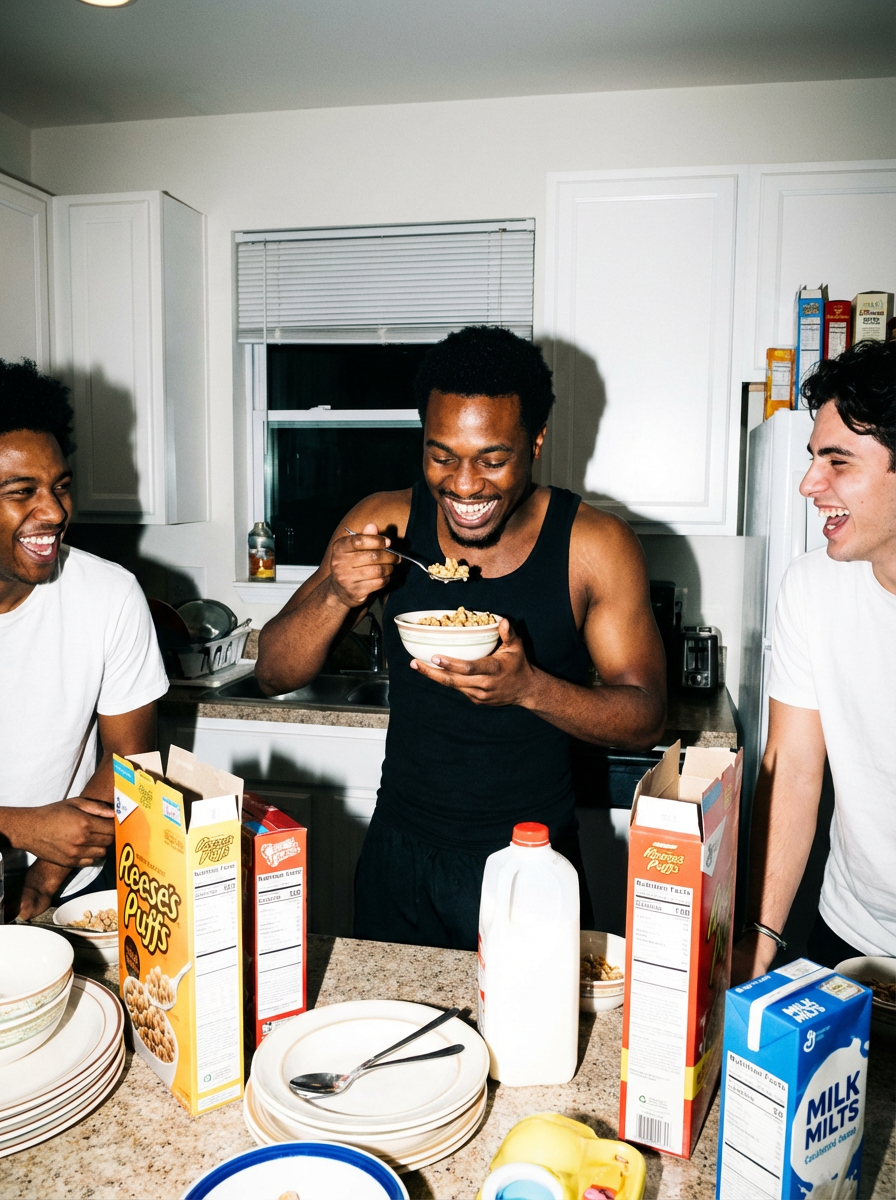 camera flash overexposed, model in a kitchen with friends making midnight snacks. Wearing tank top, eating cereal. Flash-lit, cluttered, fun chaos.