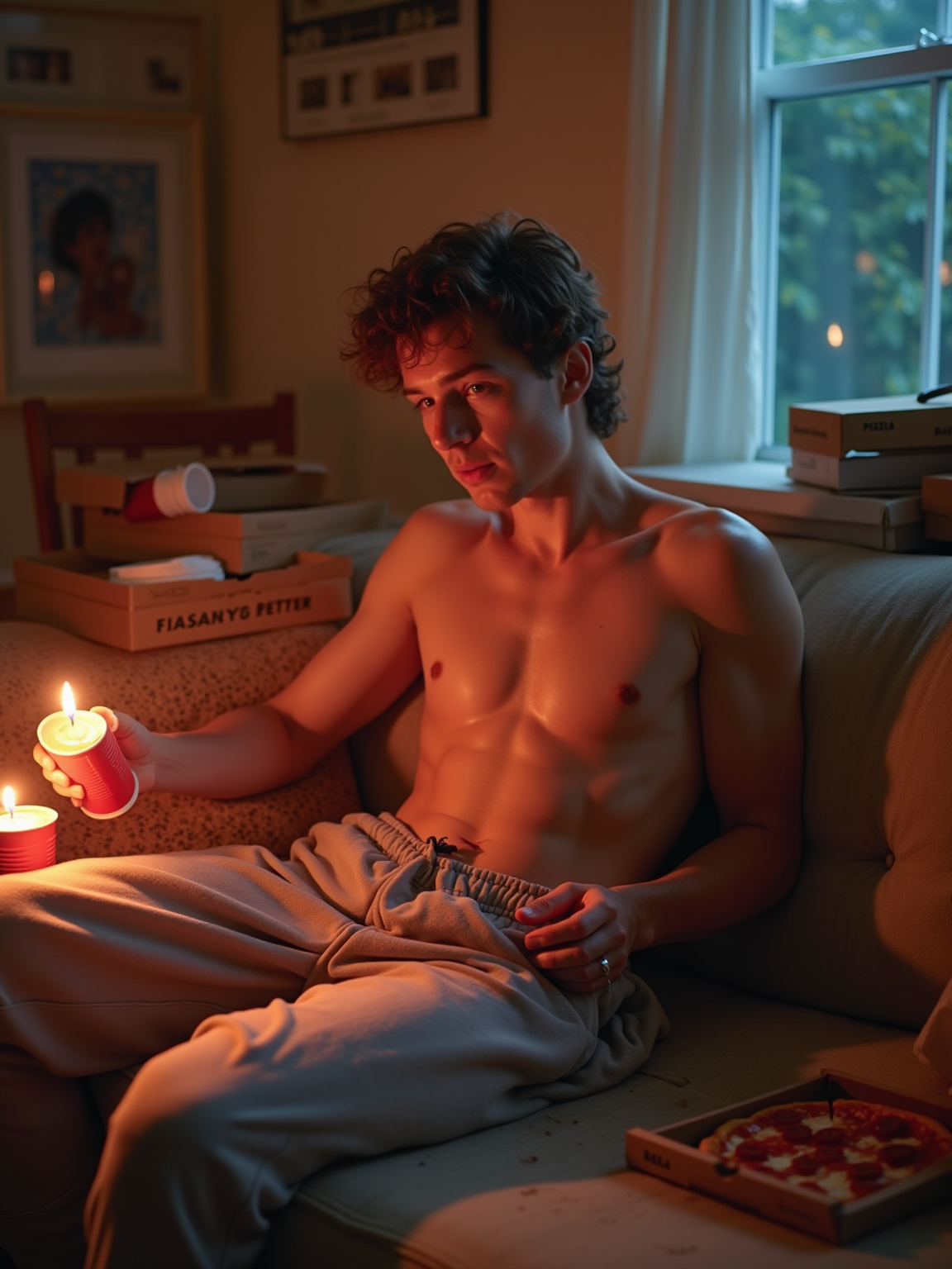 camera flash overexposed, model in a messy living room, pizza boxes and party cups everywhere. Wearing sweatpants, slouched on couch. Flash, aftermath, real life.