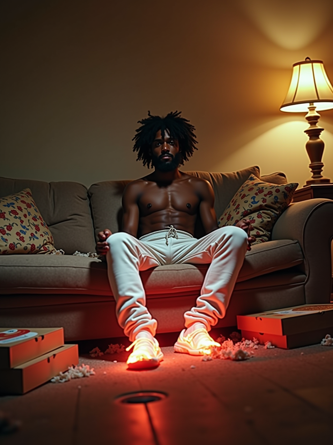 camera flash overexposed, model in a messy living room, pizza boxes and party cups everywhere. Wearing sweatpants, slouched on couch. Flash, aftermath, real life.