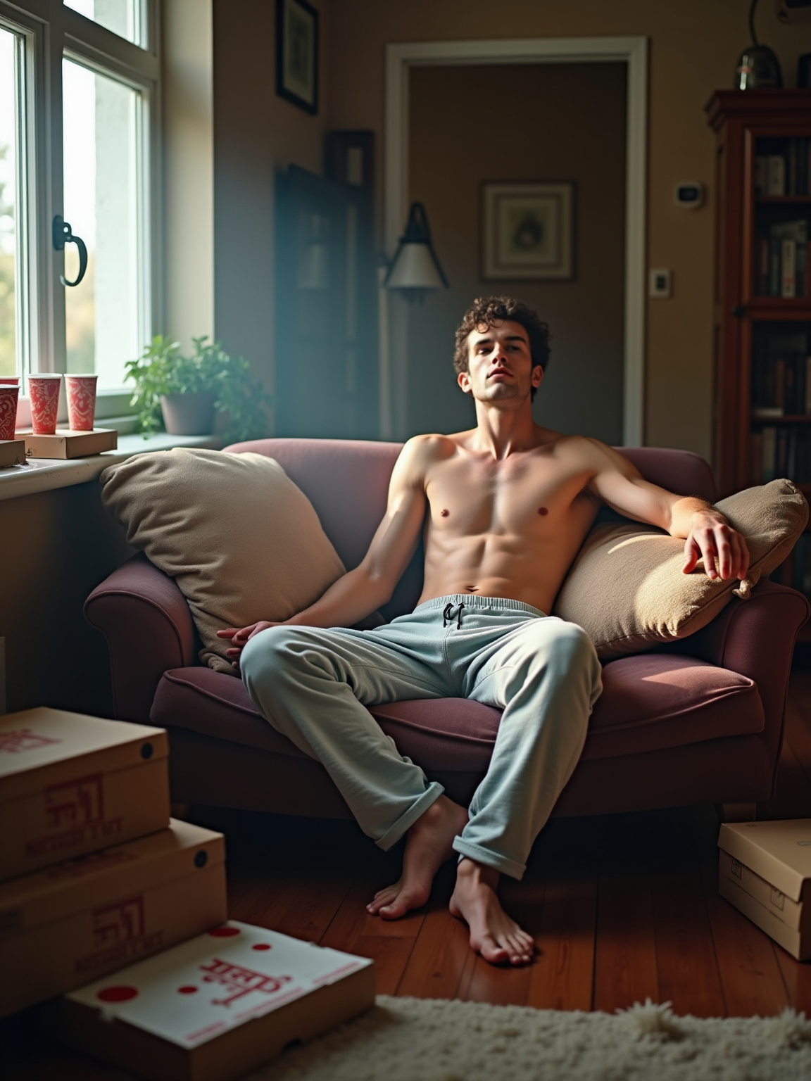 camera flash overexposed, model in a messy living room, pizza boxes and party cups everywhere. Wearing sweatpants, slouched on couch. Flash, aftermath, real life.
