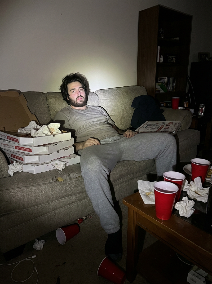 camera flash overexposed, model in a messy living room, pizza boxes and party cups everywhere. Wearing sweatpants, slouched on couch. Flash, aftermath, real life.