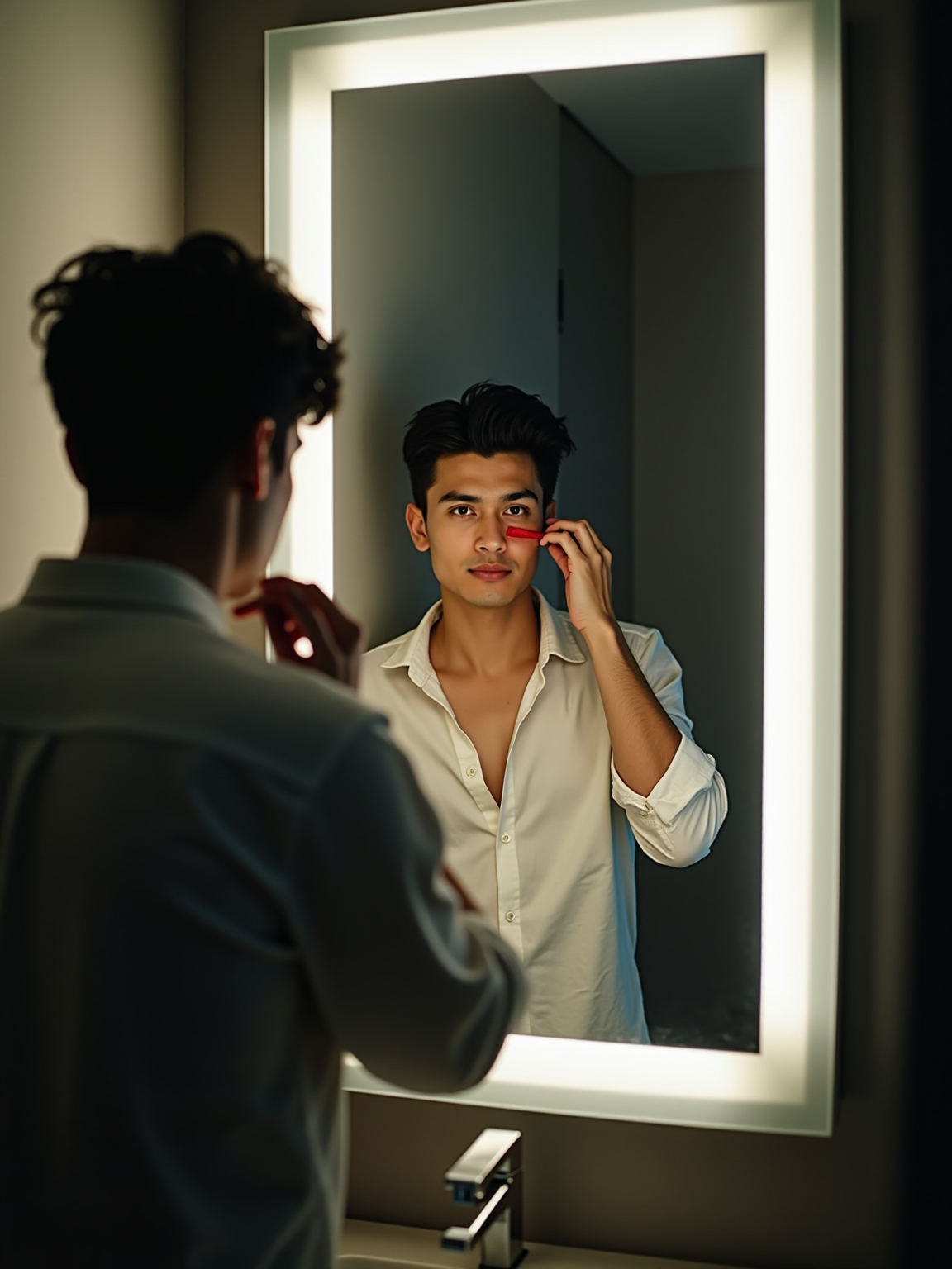 camera flash overexposed, model in front of a bathroom mirror, lipstick smudged. Wearing button-up, fixing hair. Flash, mirror reflection, end of night.
