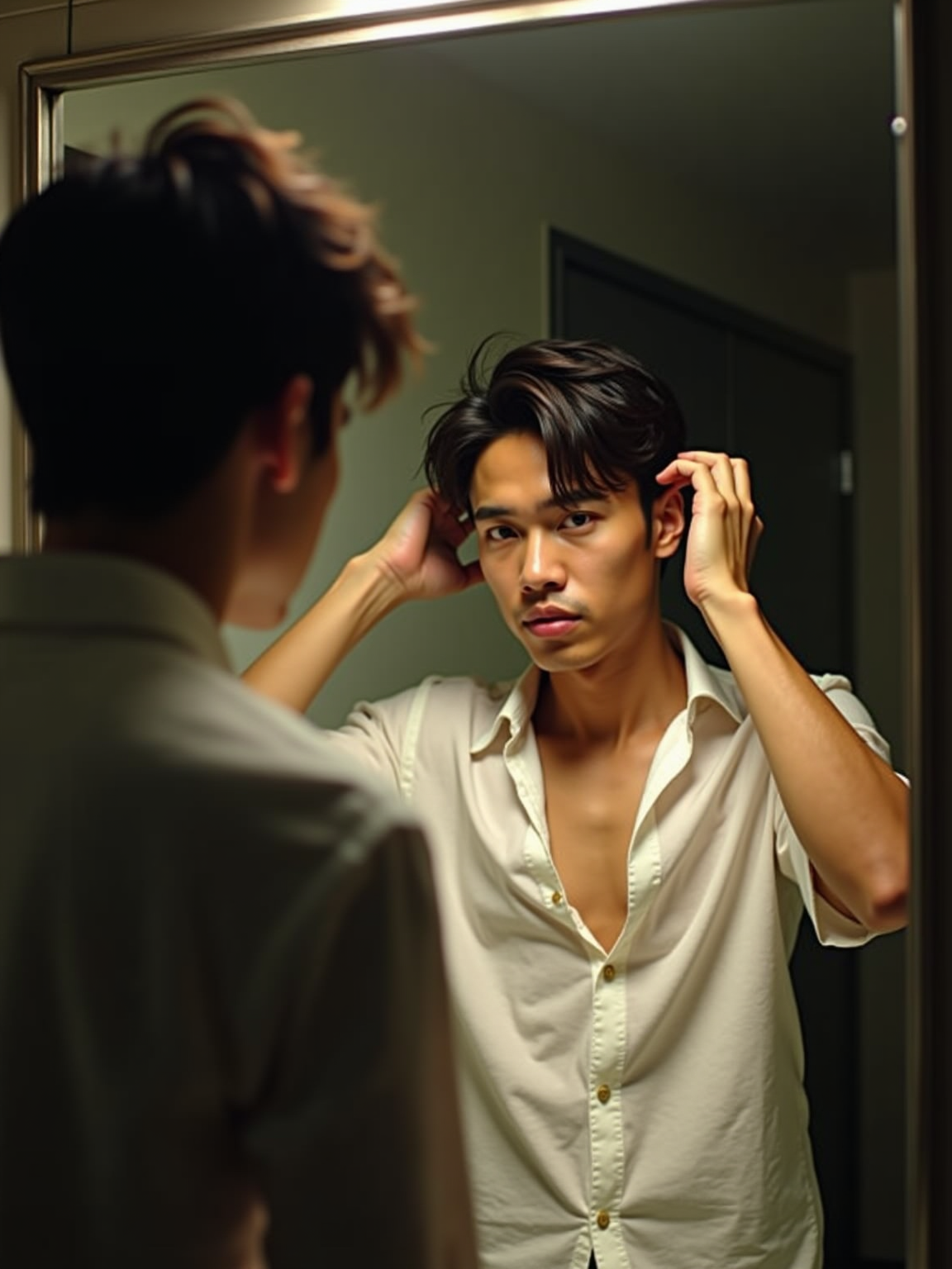 camera flash overexposed, model in front of a bathroom mirror, lipstick smudged. Wearing button-up, fixing hair. Flash, mirror reflection, end of night.