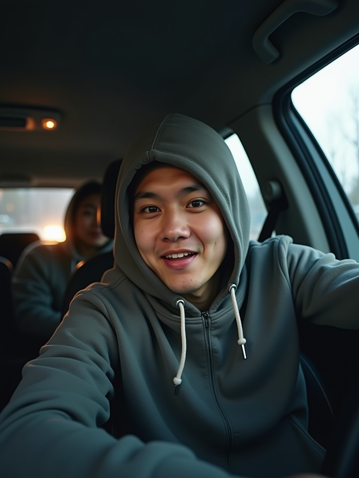 camera flash overexposed, model in the backseat of a car with friends, windows fogged up. Wearing hoodie, making a silly face. Flash glare, cramped space, candid energy.