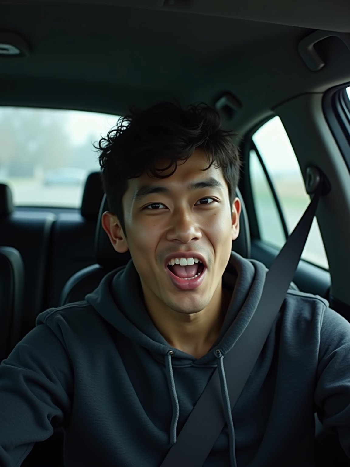 camera flash overexposed, model in the backseat of a car with friends, windows fogged up. Wearing hoodie, making a silly face. Flash glare, cramped space, candid energy.