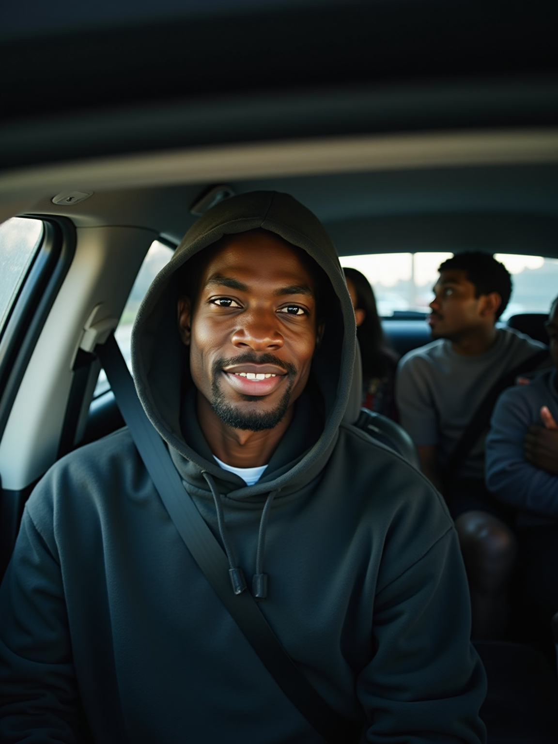 camera flash overexposed, model in the backseat of a car with friends, windows fogged up. Wearing hoodie, making a silly face. Flash glare, cramped space, candid energy.