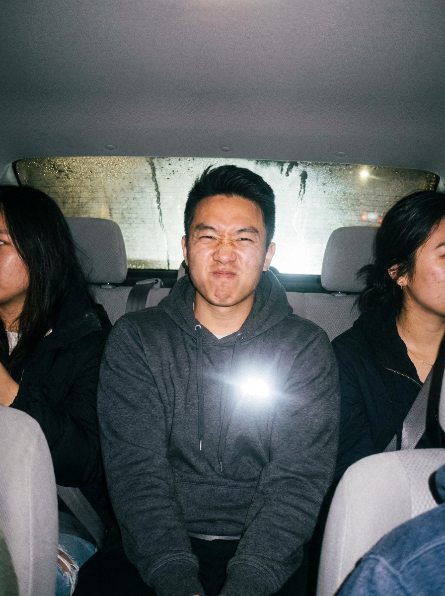 camera flash overexposed, model in the backseat of a car with friends, windows fogged up. Wearing hoodie, making a silly face. Flash glare, cramped space, candid energy.