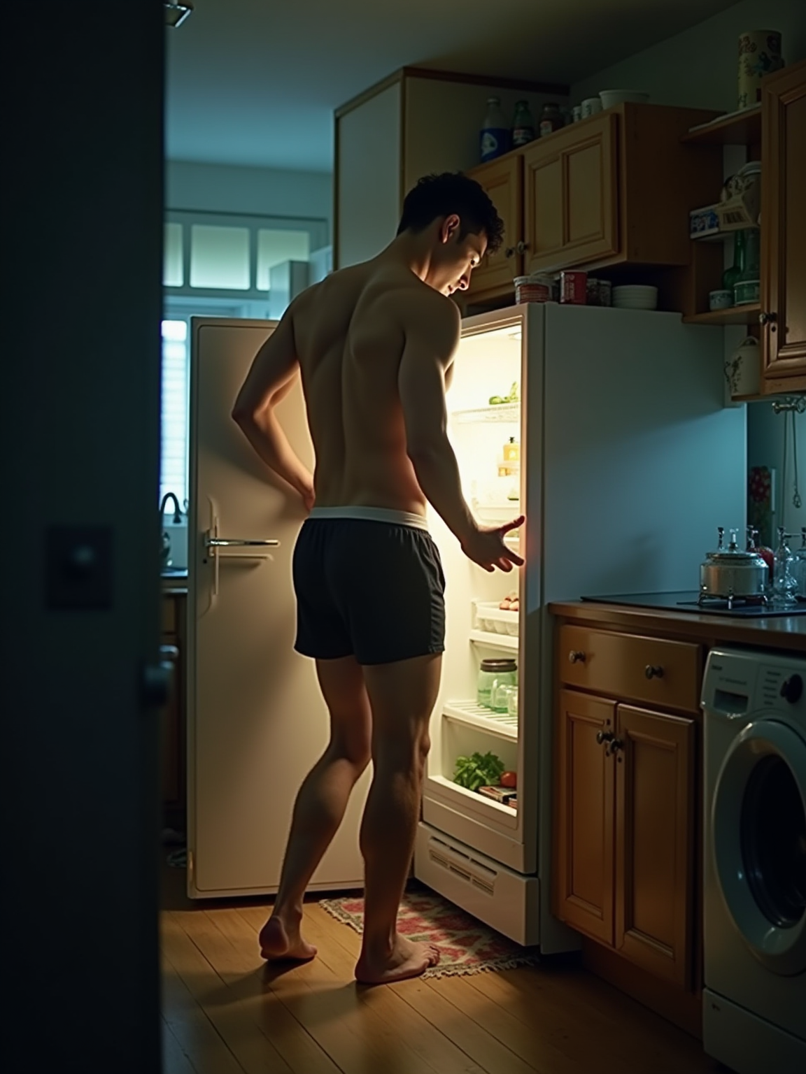 camera flash overexposed, model opening the fridge at 3am, kitchen a mess. Wearing boxers, searching for snacks. Flash-lit, real life, afterparty.