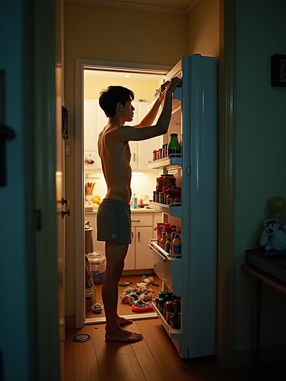 camera flash overexposed, model opening the fridge at 3am, kitchen a mess. Wearing boxers, searching for snacks. Flash-lit, real life, afterparty.