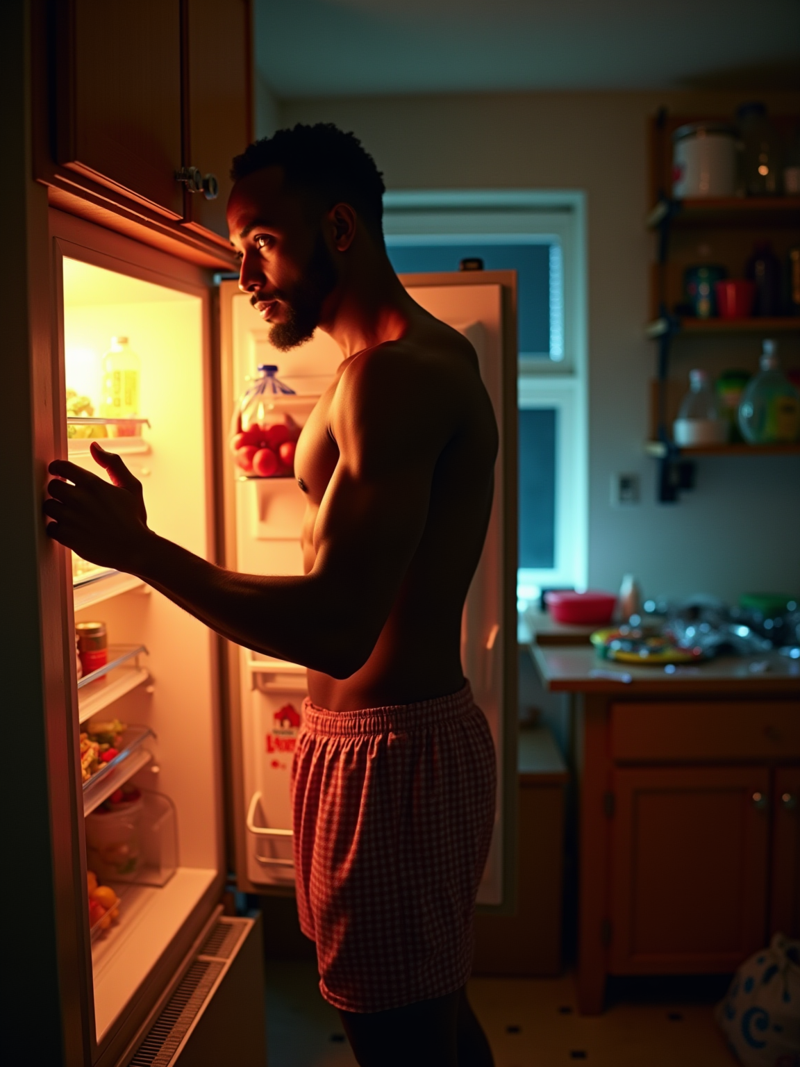 camera flash overexposed, model opening the fridge at 3am, kitchen a mess. Wearing boxers, searching for snacks. Flash-lit, real life, afterparty.
