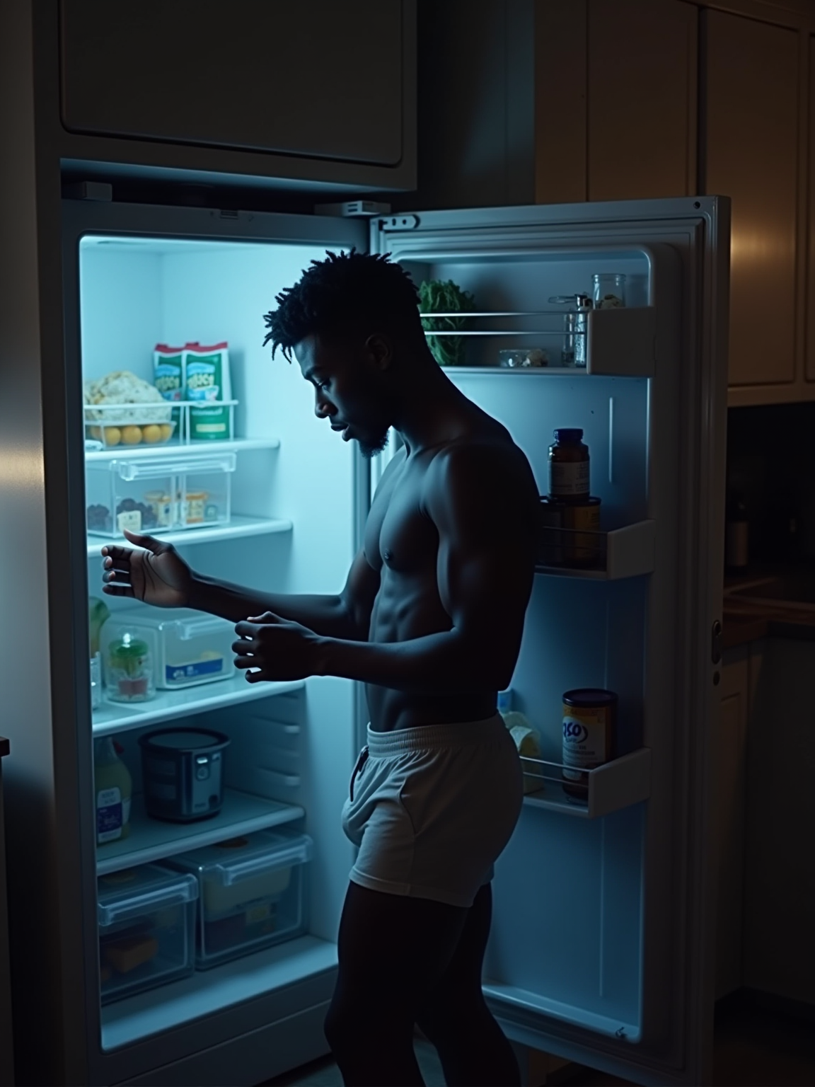 camera flash overexposed, model opening the fridge at 3am, kitchen a mess. Wearing boxers, searching for snacks. Flash-lit, real life, afterparty.