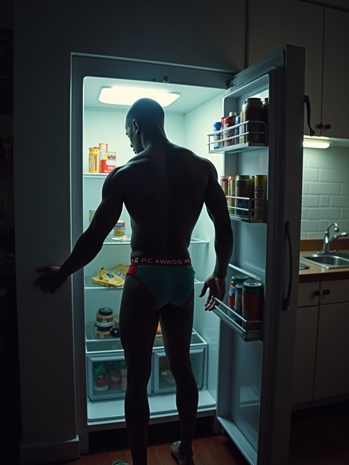 camera flash overexposed, model opening the fridge at 3am, kitchen a mess. Wearing boxers, searching for snacks. Flash-lit, real life, afterparty.