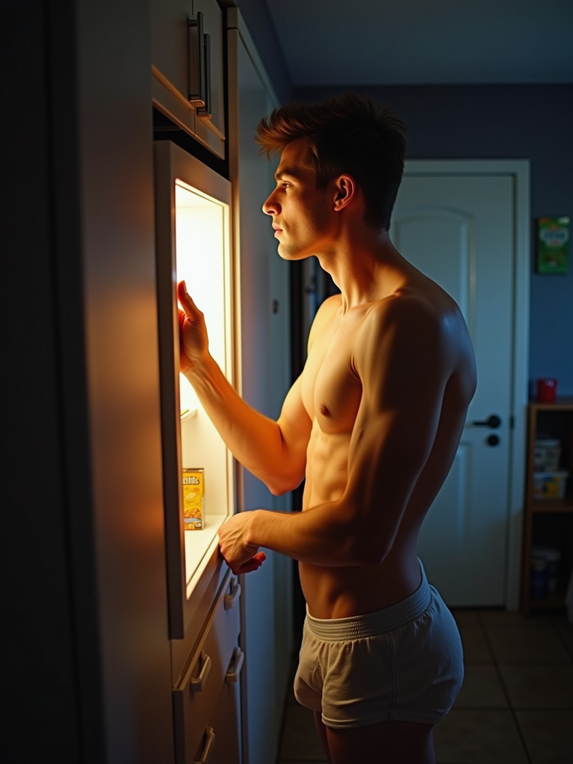 camera flash overexposed, model opening the fridge at 3am, kitchen a mess. Wearing boxers, searching for snacks. Flash-lit, real life, afterparty.