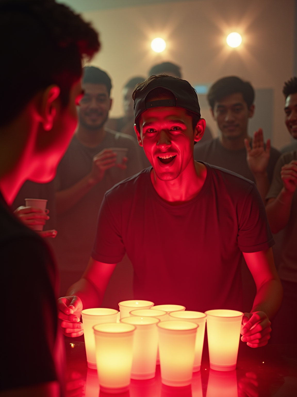 camera flash overexposed, model playing beer pong in a crowded living room. Wearing backwards cap, cheering. Flash-lit, party game, fun chaos.