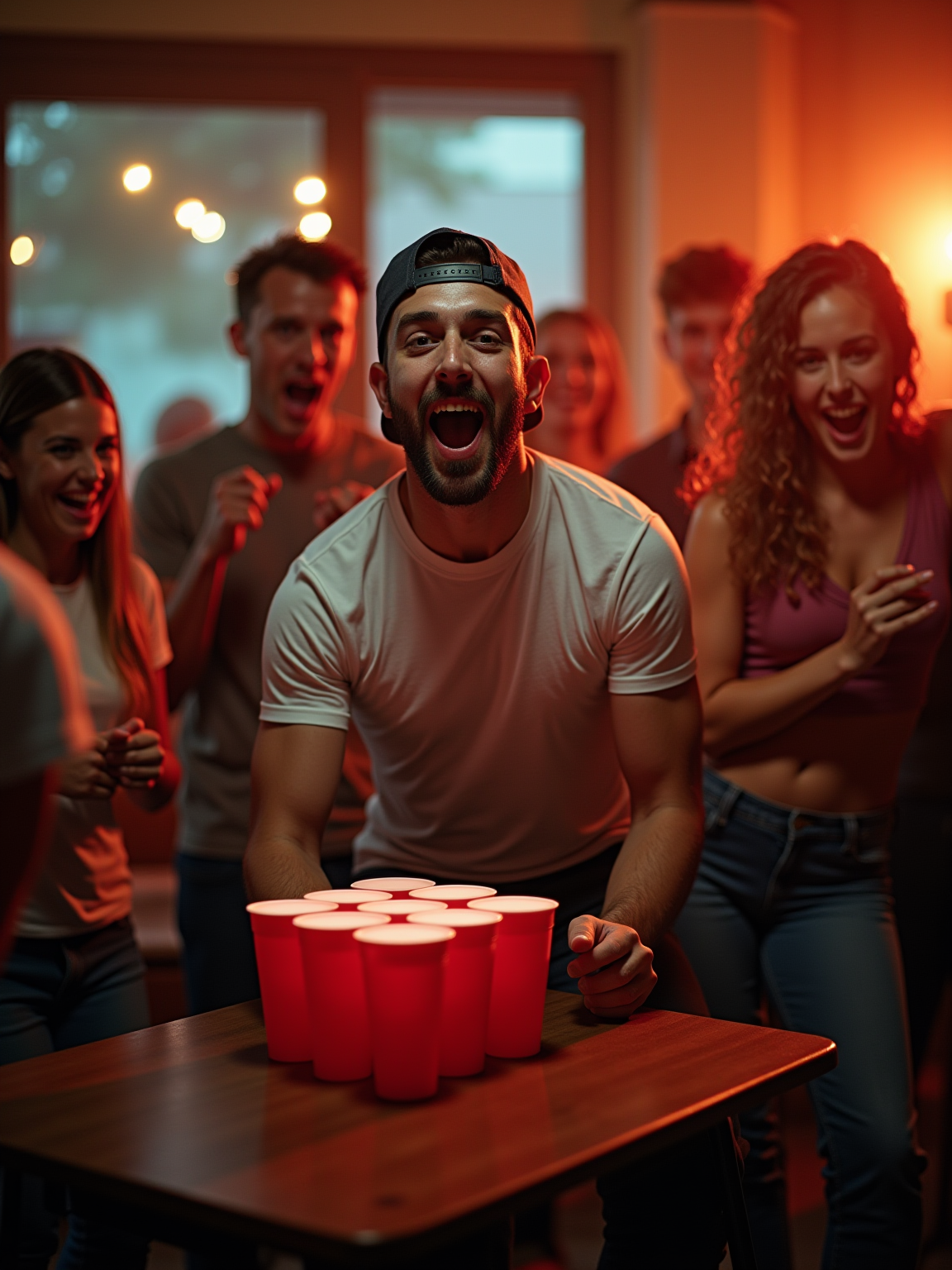 camera flash overexposed, model playing beer pong in a crowded living room. Wearing backwards cap, cheering. Flash-lit, party game, fun chaos.