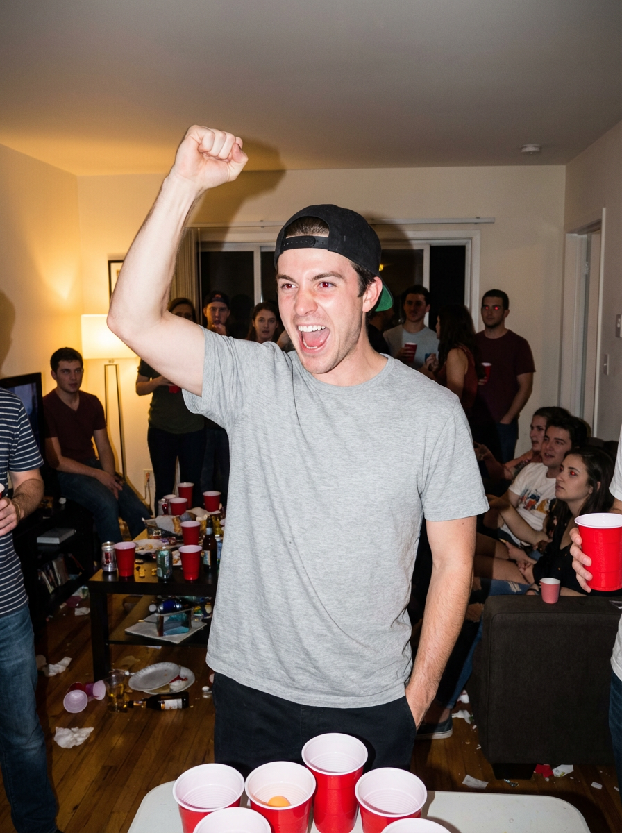 camera flash overexposed, model playing beer pong in a crowded living room. Wearing backwards cap, cheering. Flash-lit, party game, fun chaos.