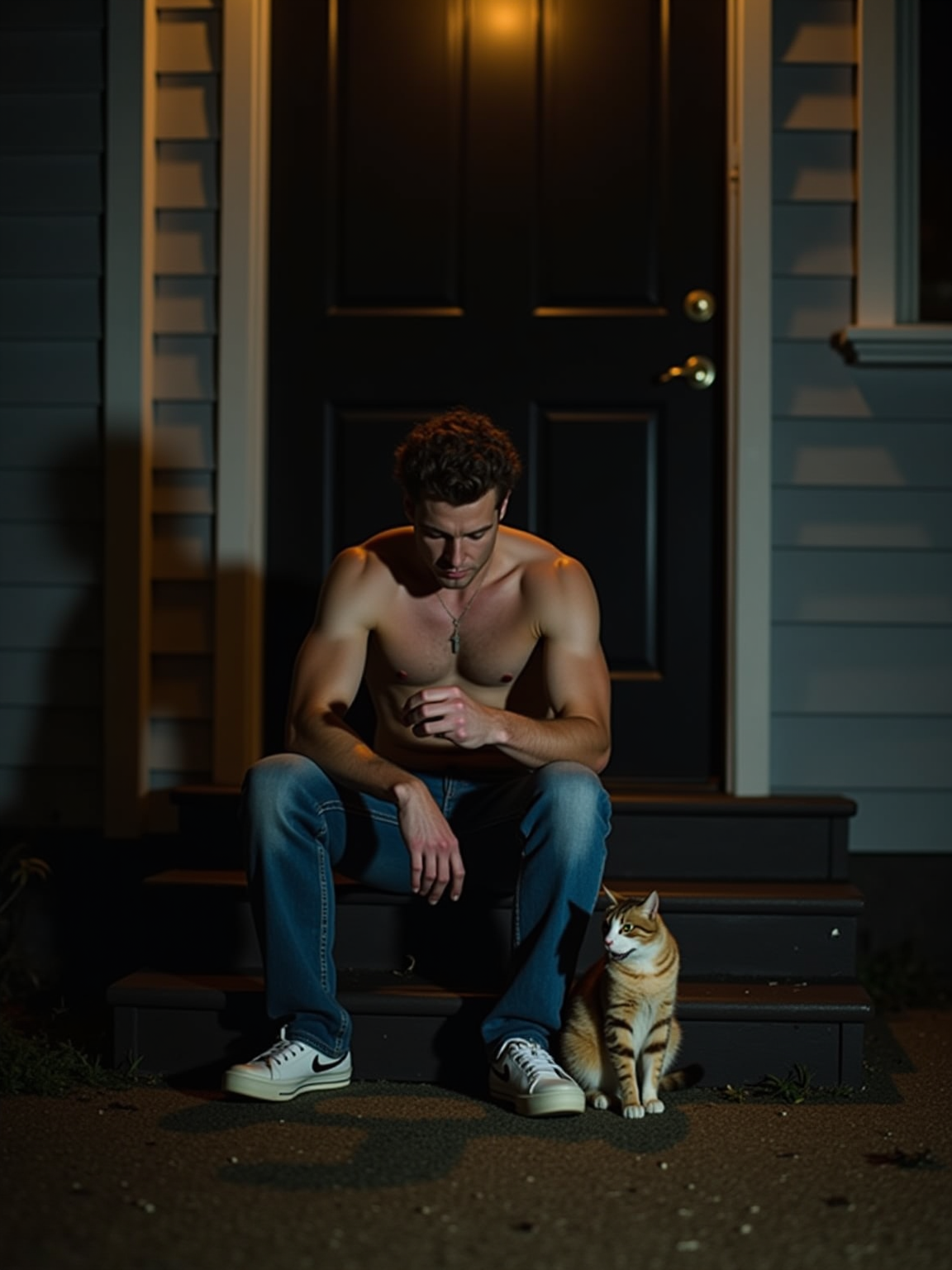 camera flash overexposed, model sitting on a porch step with a stray cat at night. Wearing jeans, feeding cat. Flash-lit, quiet night, unexpected company.