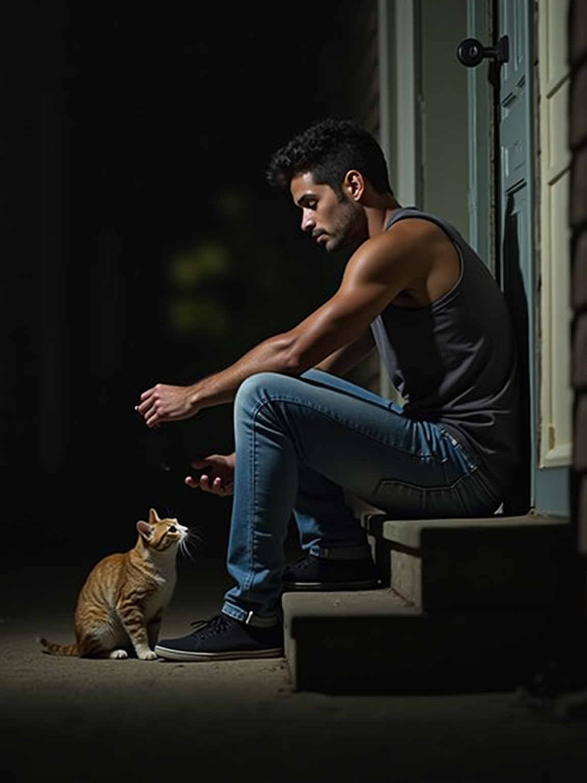camera flash overexposed, model sitting on a porch step with a stray cat at night. Wearing jeans, feeding cat. Flash-lit, quiet night, unexpected company.