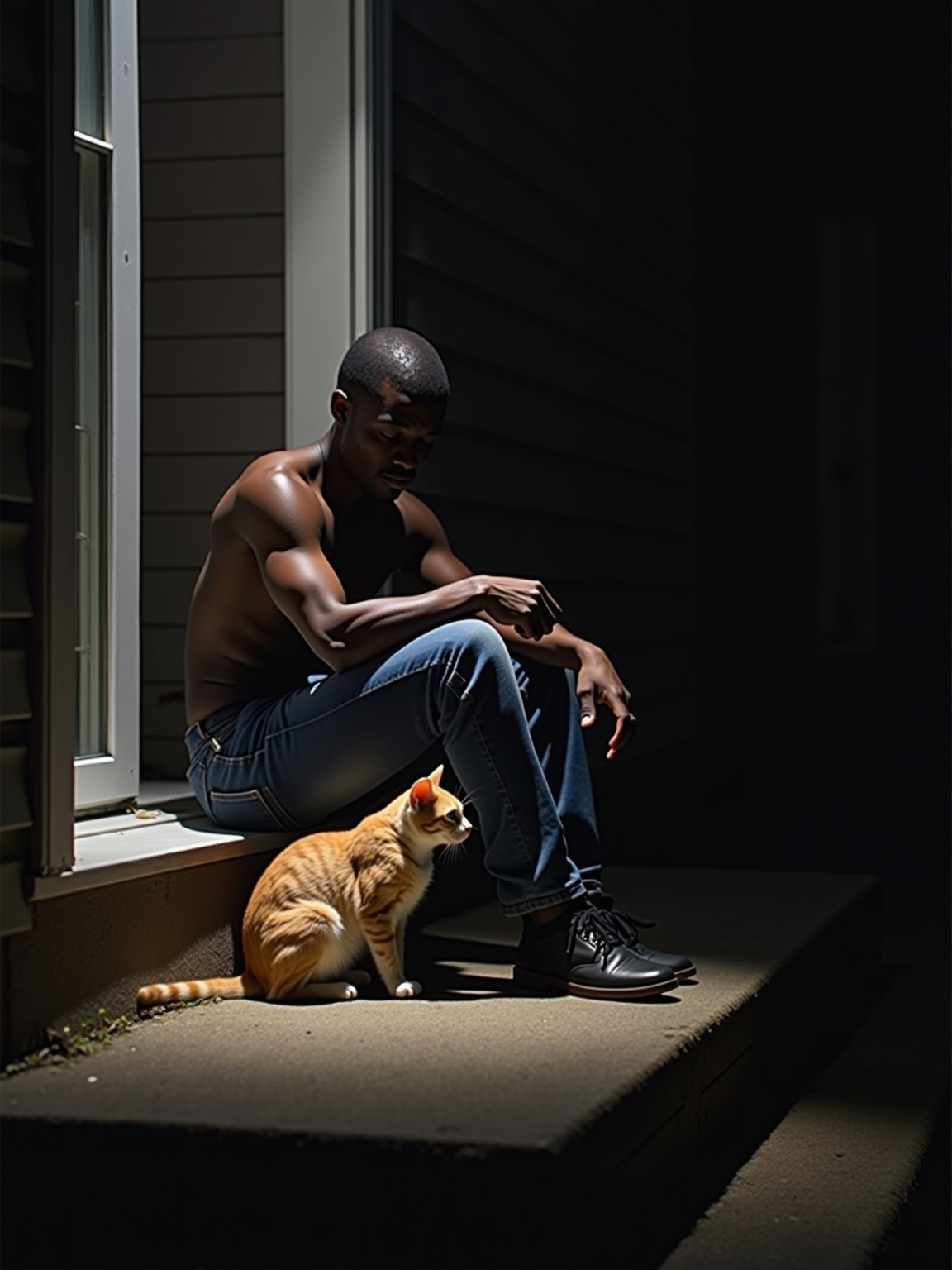 camera flash overexposed, model sitting on a porch step with a stray cat at night. Wearing jeans, feeding cat. Flash-lit, quiet night, unexpected company.