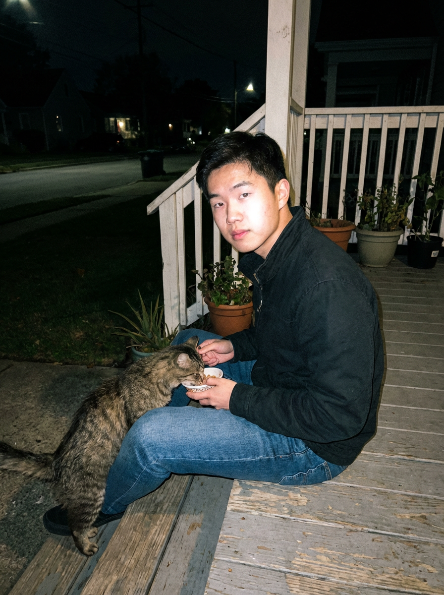 camera flash overexposed, model sitting on a porch step with a stray cat at night. Wearing jeans, feeding cat. Flash-lit, quiet night, unexpected company.