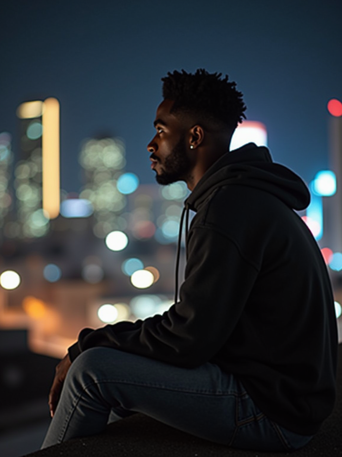 camera flash overexposed, model sitting on a rooftop at night, city lights in background. Wearing hoodie, looking at skyline. Flash foreground, city bokeh, urban adventure.