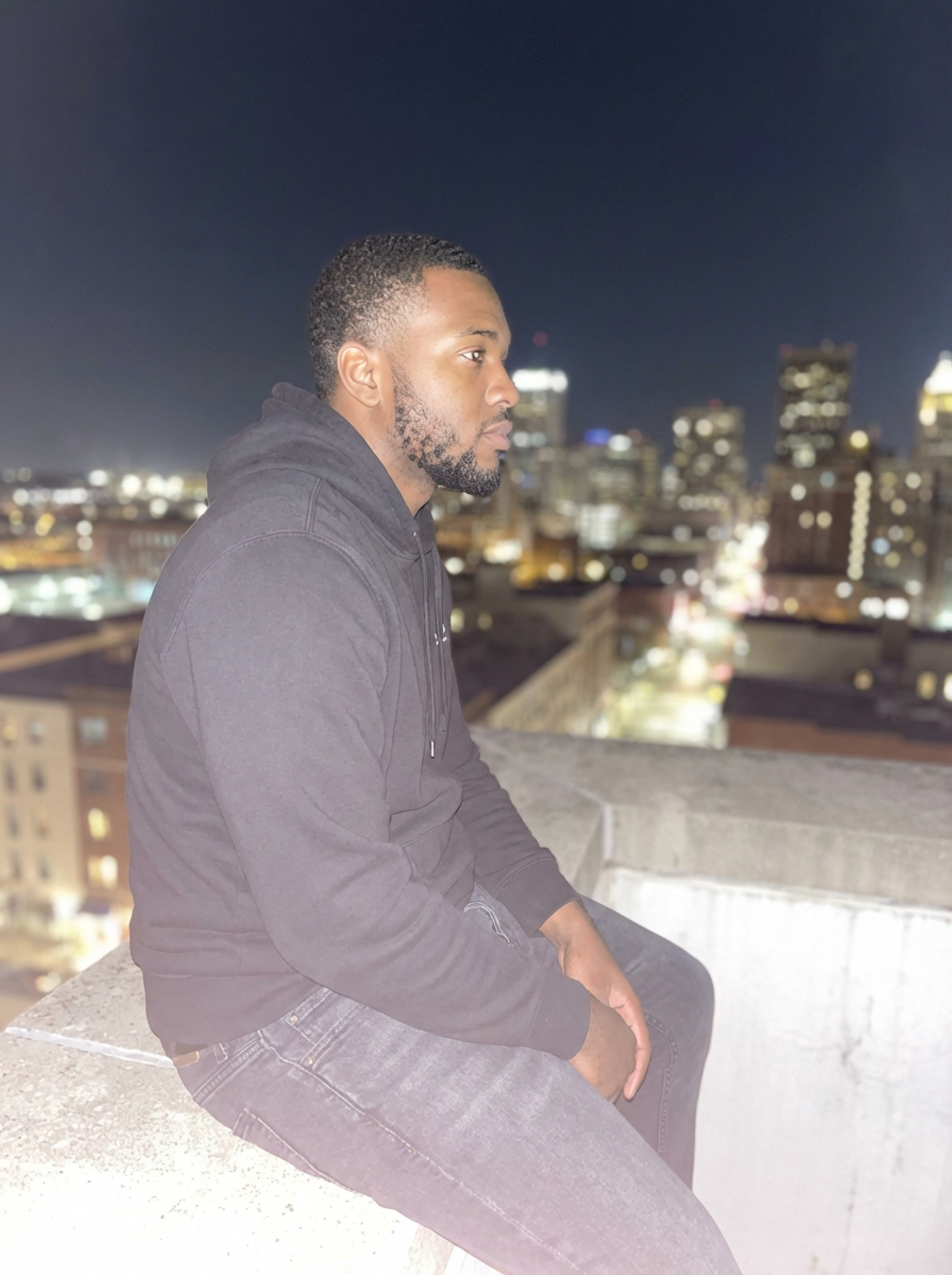camera flash overexposed, model sitting on a rooftop at night, city lights in background. Wearing hoodie, looking at skyline. Flash foreground, city bokeh, urban adventure.