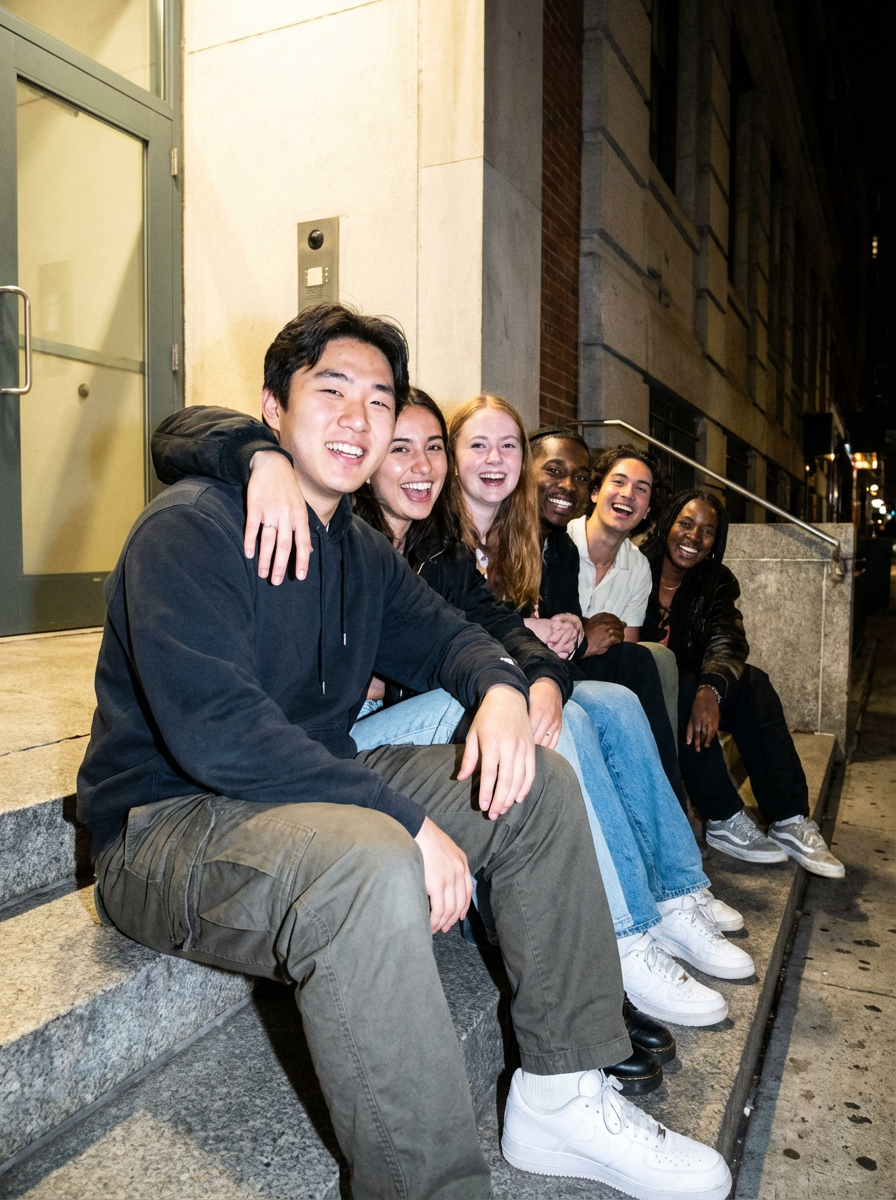 camera flash overexposed, model sitting on a staircase with friends, flash. Wearing cargo pants, arm around friend. Flash harshness, group energy, realness.