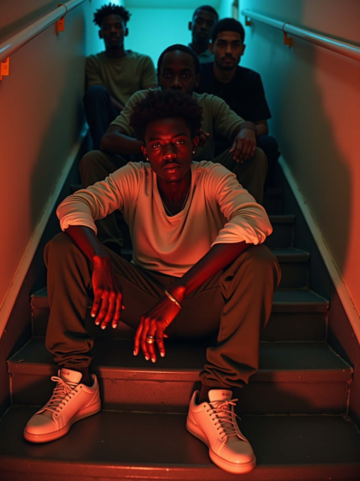 camera flash overexposed, model sitting on a staircase with friends, red eyes from flash. Wearing cargo pants, arm around friend. Flash harshness, group energy, realness.