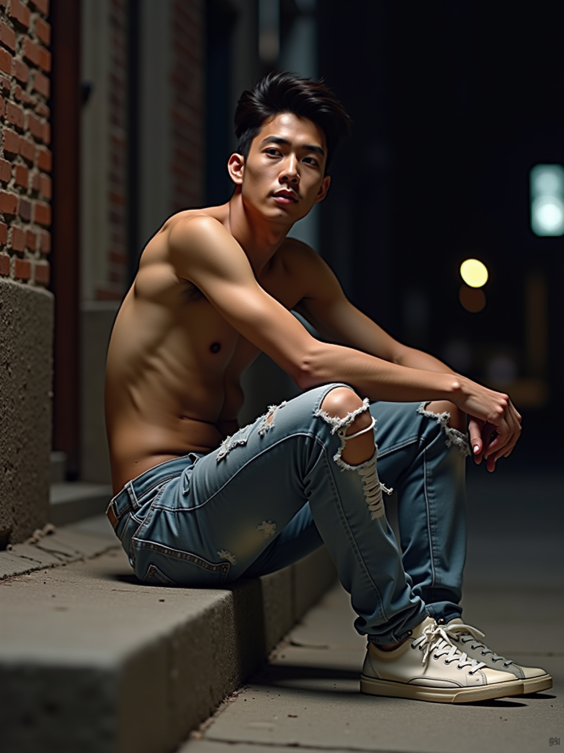 camera flash overexposed, model sitting on the curb outside a party. Wearing ripped jeans, sneakers, looking contemplative. Night street, harsh flash, spontaneous moment.