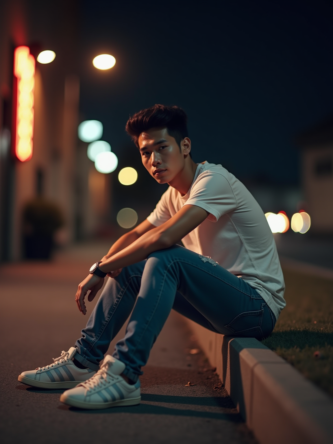 camera flash overexposed, model sitting on the curb outside a party. Wearing ripped jeans, sneakers, looking contemplative. Night street, harsh flash, spontaneous moment.