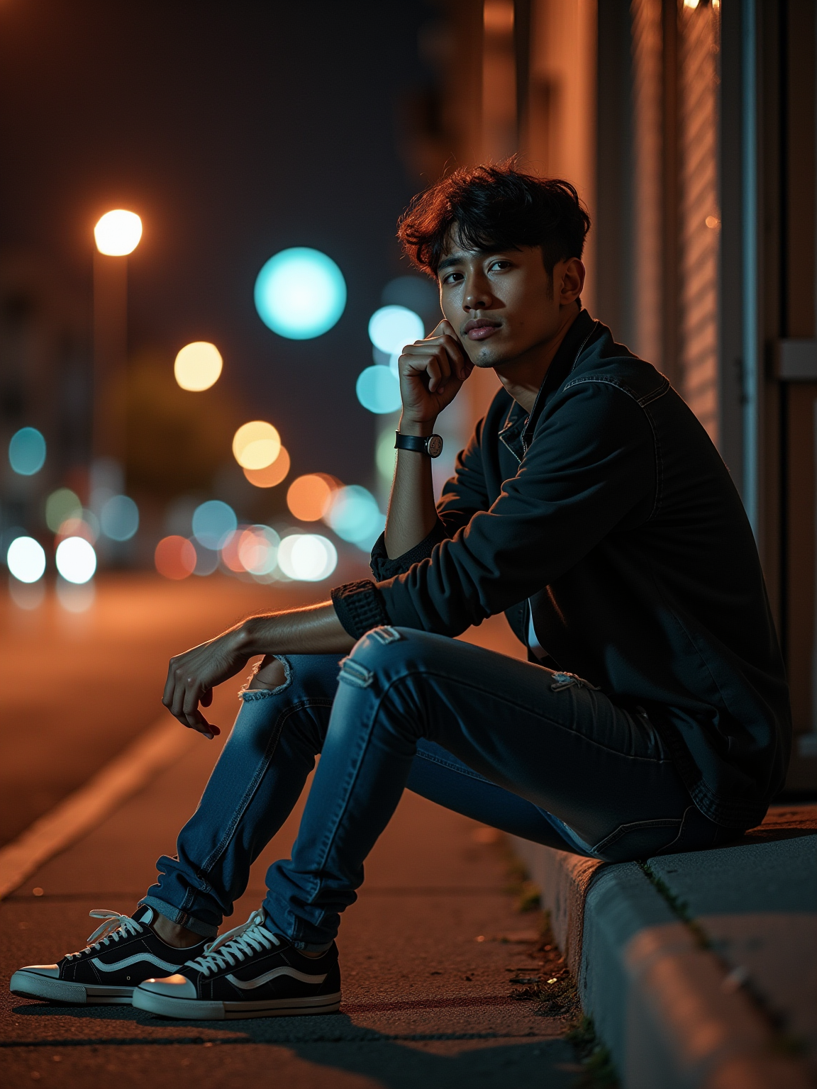 camera flash overexposed, model sitting on the curb outside a party. Wearing ripped jeans, sneakers, looking contemplative. Night street, harsh flash, spontaneous moment.