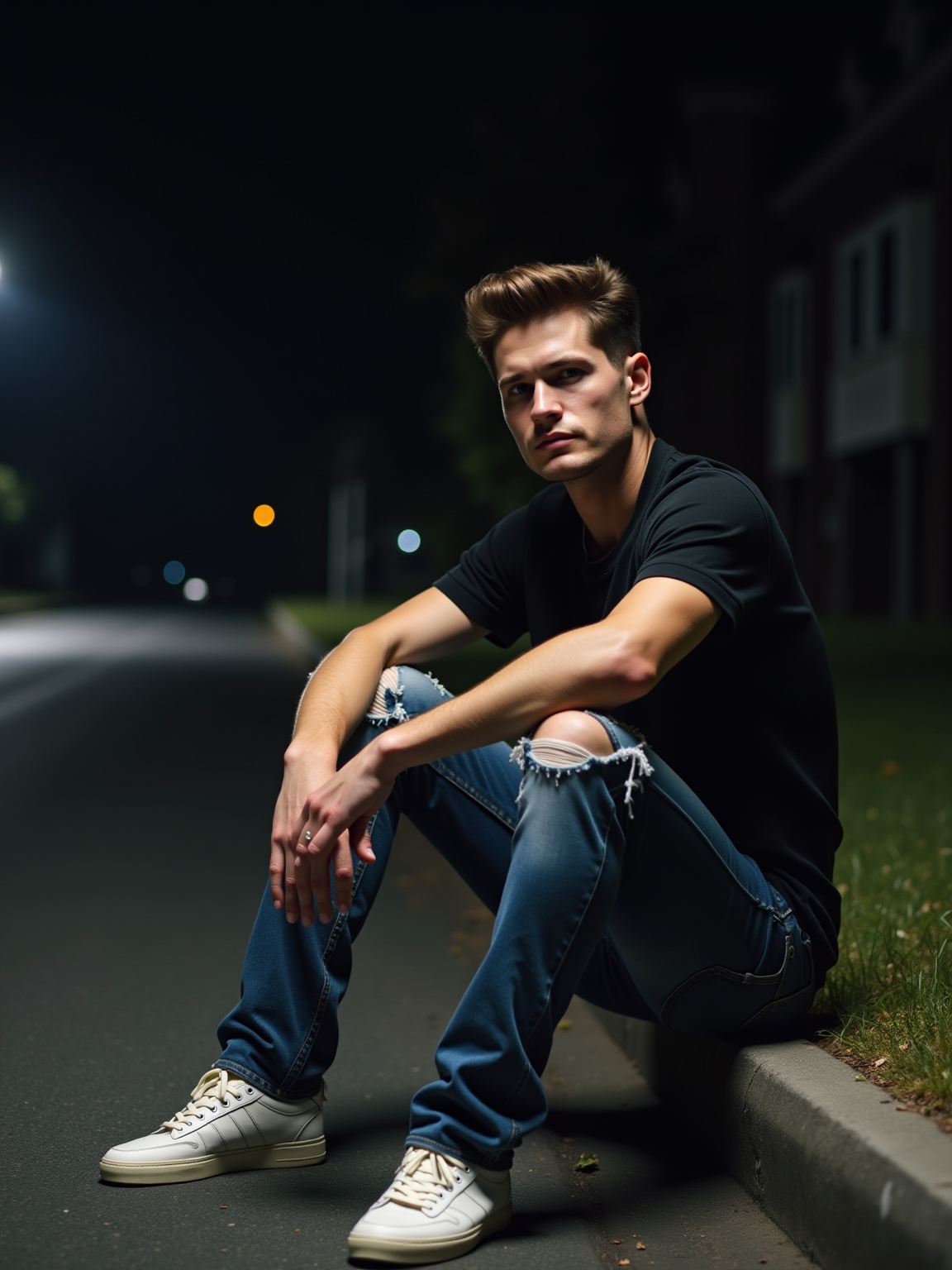 camera flash overexposed, model sitting on the curb outside a party. Wearing ripped jeans, sneakers, looking contemplative. Night street, harsh flash, spontaneous moment.