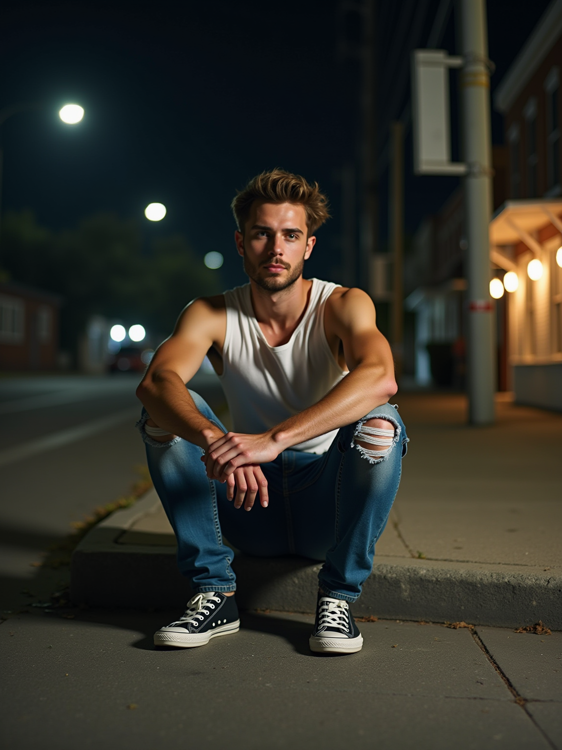 camera flash overexposed, model sitting on the curb outside a party. Wearing ripped jeans, sneakers, looking contemplative. Night street, harsh flash, spontaneous moment.